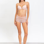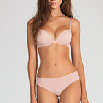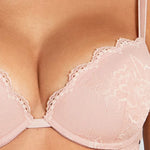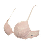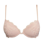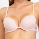 Push-up con coppe imbottite, ferretto e lunette estraibili. Reggiseno realizzato in morbido pizzo dal prezioso smerlo con romantica trama floreale. Ideale per valorizzare e sostenere il décolleté. Crea infinite combinazioni con gli slip in pizzo e microfibra in nuance.