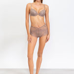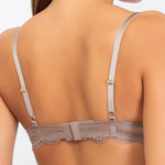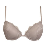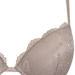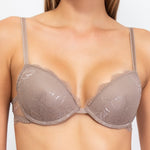 Push-up con coppe imbottite, ferretto e lunette estraibili. Reggiseno realizzato in morbido pizzo dal prezioso smerlo con romantica trama floreale. Ideale per valorizzare e sostenere il décolleté. Crea infinite combinazioni con gli slip in pizzo e microfibra in nuance.