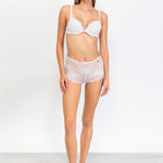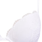 Push-up con coppe imbottite, ferretto e lunette estraibili. Reggiseno realizzato in morbido pizzo dal prezioso smerlo con romantica trama floreale. Ideale per valorizzare e sostenere il décolleté. Crea infinite combinazioni con gli slip in pizzo e microfibra in nuance.