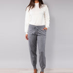 Pantalone con polsino in morbida viscosa a costine, dotato di tasche e coulisse regolabile in vita per una vestibilità personalizzata. Un capo che unisce comfort e stile.