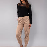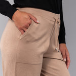 Pantalone con polsino in morbida viscosa, dotato di tasche e coulisse regolabile in vita per una vestibilità personalizzata. Un capo che unisce comfort e stile.