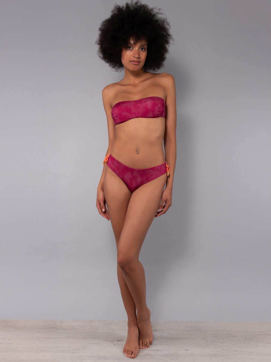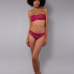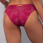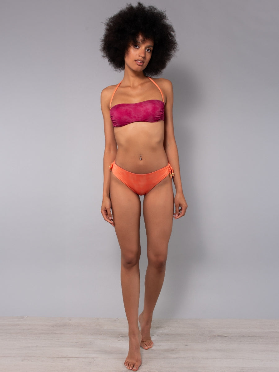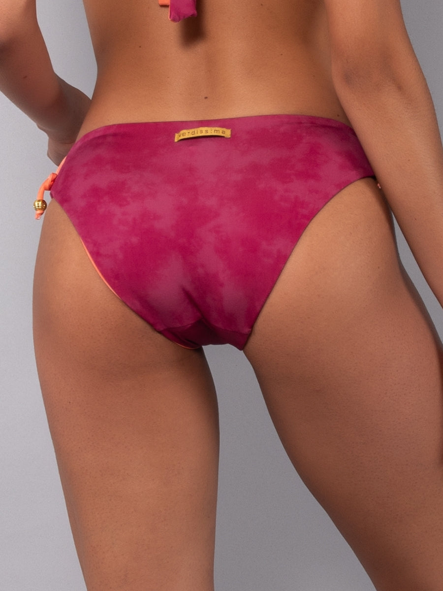 Slip fisso con fianco leggermente alto, arricchito da laccetti laterali non removibili che possono essere annodati a piacimento per personalizzare l'altezza del fianco, creando un delicato effetto arricciato. Il modello presenta un design double face che permette di indossare il capo da entrambi i lati, scegliendo tra due diverse varianti colore, ed è completato da accessori oro. La linea essenziale e confortevole dello slip si adatta alla silhouette valorizzandola e assicurando il massimo comfort.