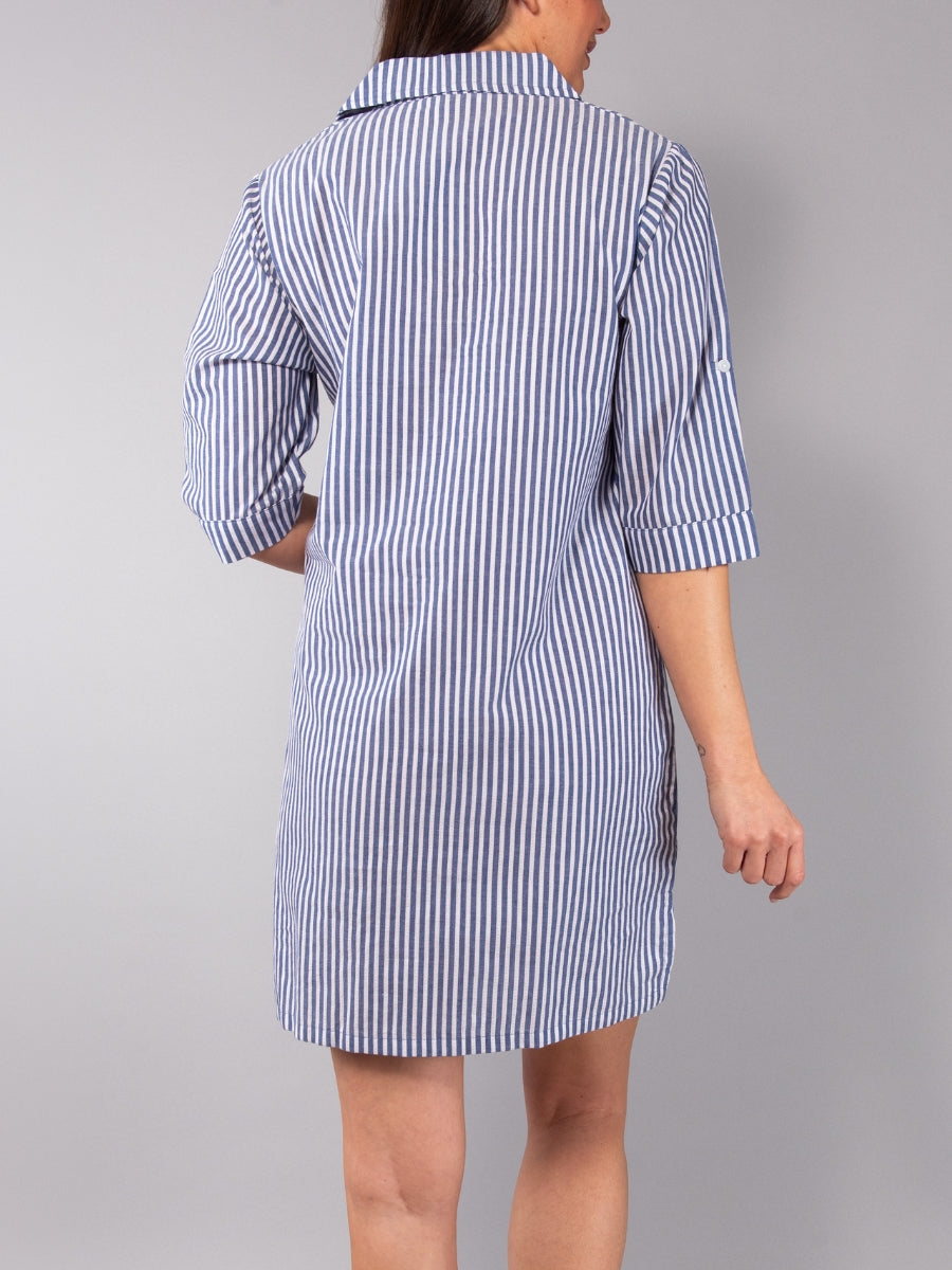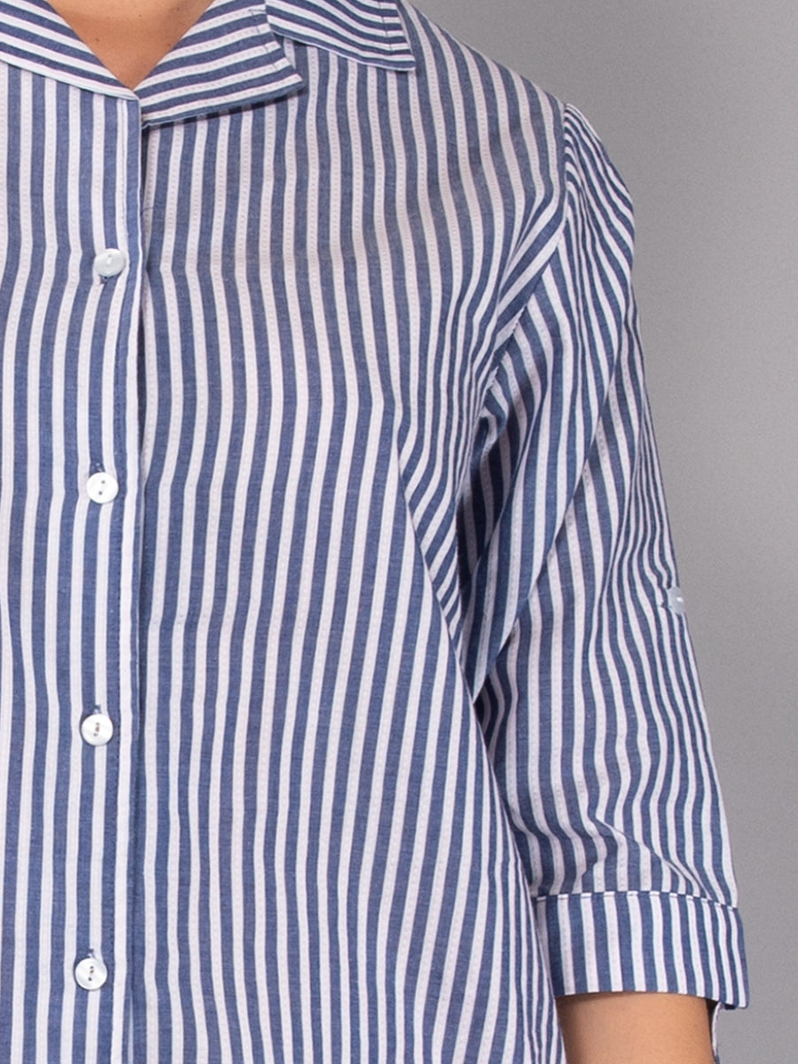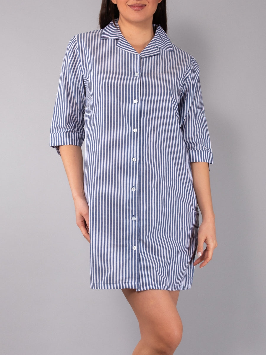 Camicia da Notte Aperta Corta in Cotone Righe - BLU - NS28