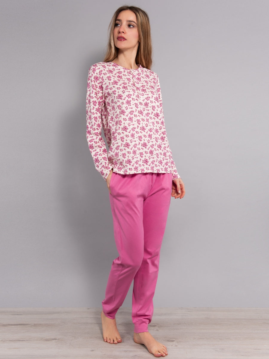 Pigiama realizzato in leggero cotone con stampa floreale Bouquet. Il set comprende la maglia serafino a manica lunga con fantasia all-over e il pantalone lungo coordinato a tinta unita con polsino e tasche. Un pigiama che si caratterizza per la vestibilità confortevole e uno stile raffinato.