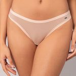 Realizzata in tulle leggero con un delicato effetto trasparente, la brasiliana assicura una vestibilità naturale e confortevole, perfetta per l'uso quotidiano. Lo stile minimale è impreziosito dalla sottile puntina in pizzo lungo i bordi, che dona un tocco raffinato ed elegante. Un modello essenziale e pratico, ideale da coordinare con i reggiseni della collezione per un look intimo moderno e sofisticato.