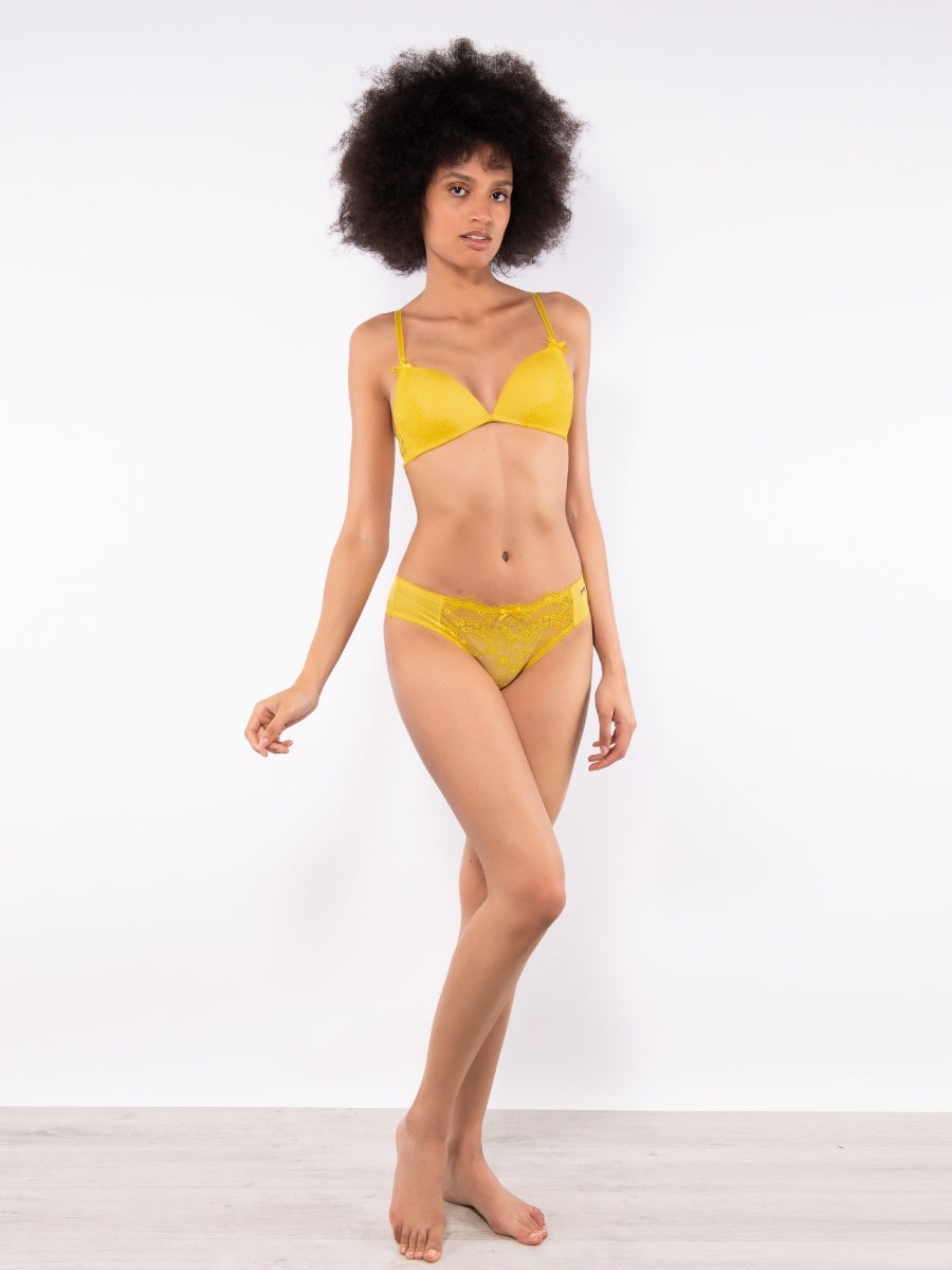 Il bordo è rifinito con una delicata puntina decorativa che aggiunge un tocco raffinato al design minimale. Un fiocchetto tono su tono applicato sul davanti completa il modello con un dettaglio discreto e femminile. Ideale da abbinare ai reggiseni in pizzo della stessa serie.