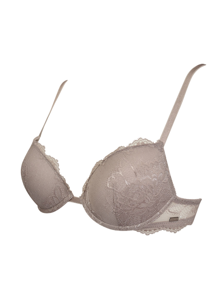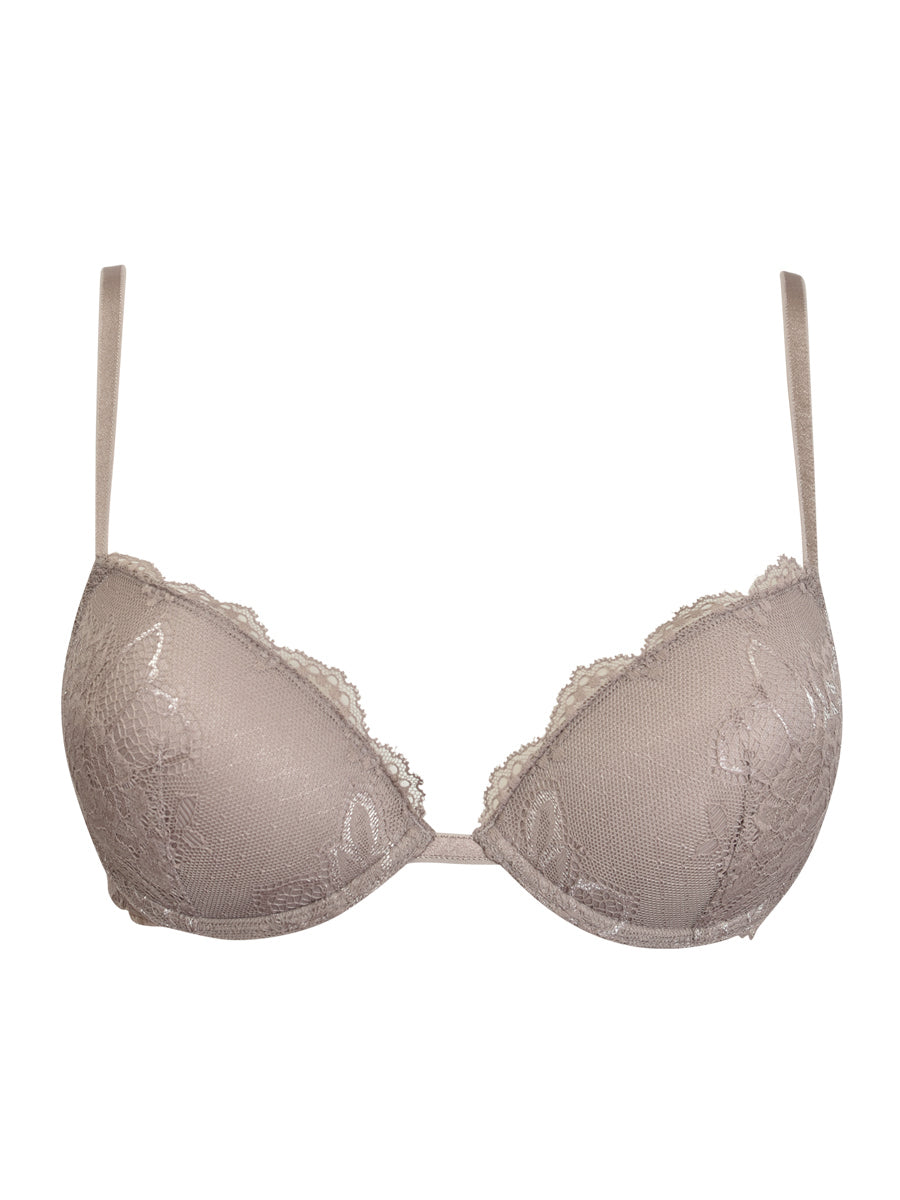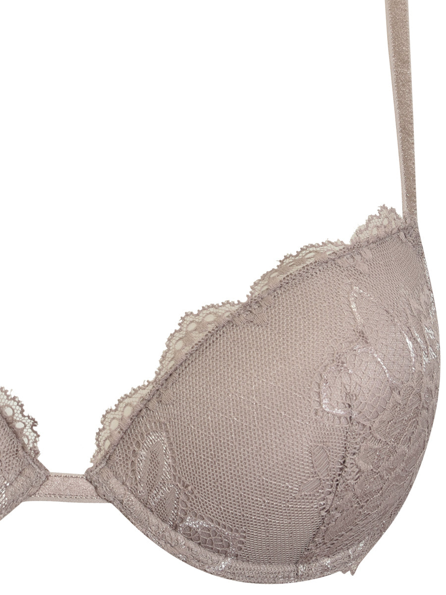 Push-up con coppe imbottite, ferretto e lunette estraibili. Reggiseno realizzato in morbido pizzo dal prezioso smerlo con romantica trama floreale. Ideale per valorizzare e sostenere il décolleté. Crea infinite combinazioni con gli slip in pizzo e microfibra in nuance.