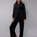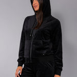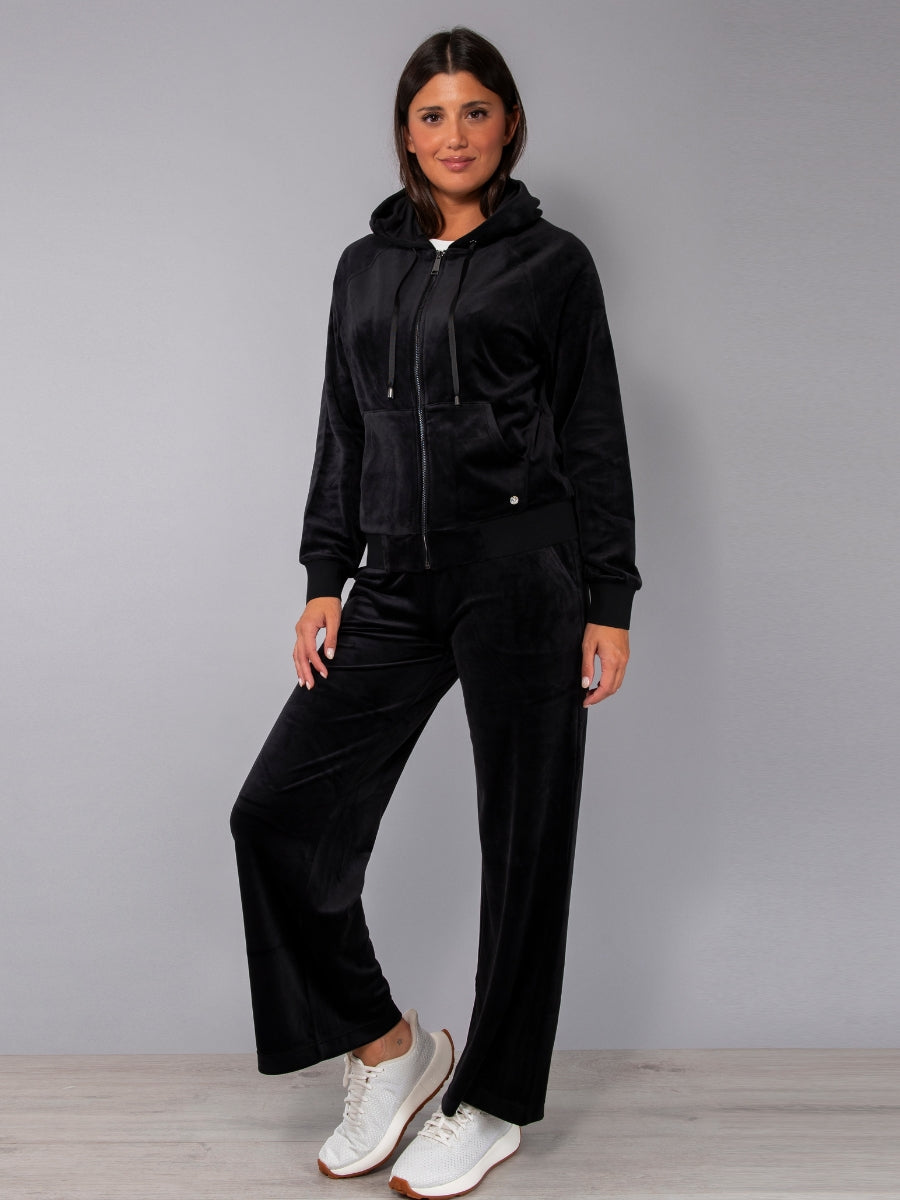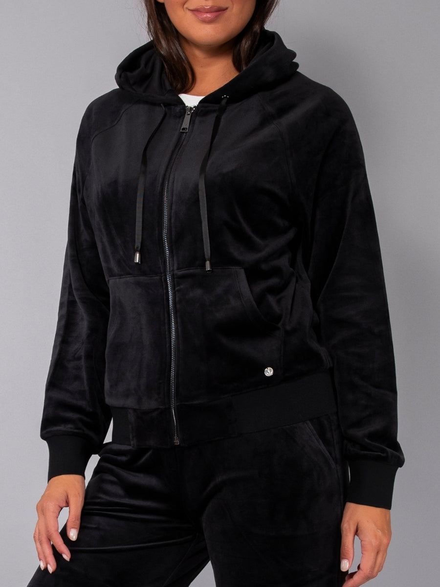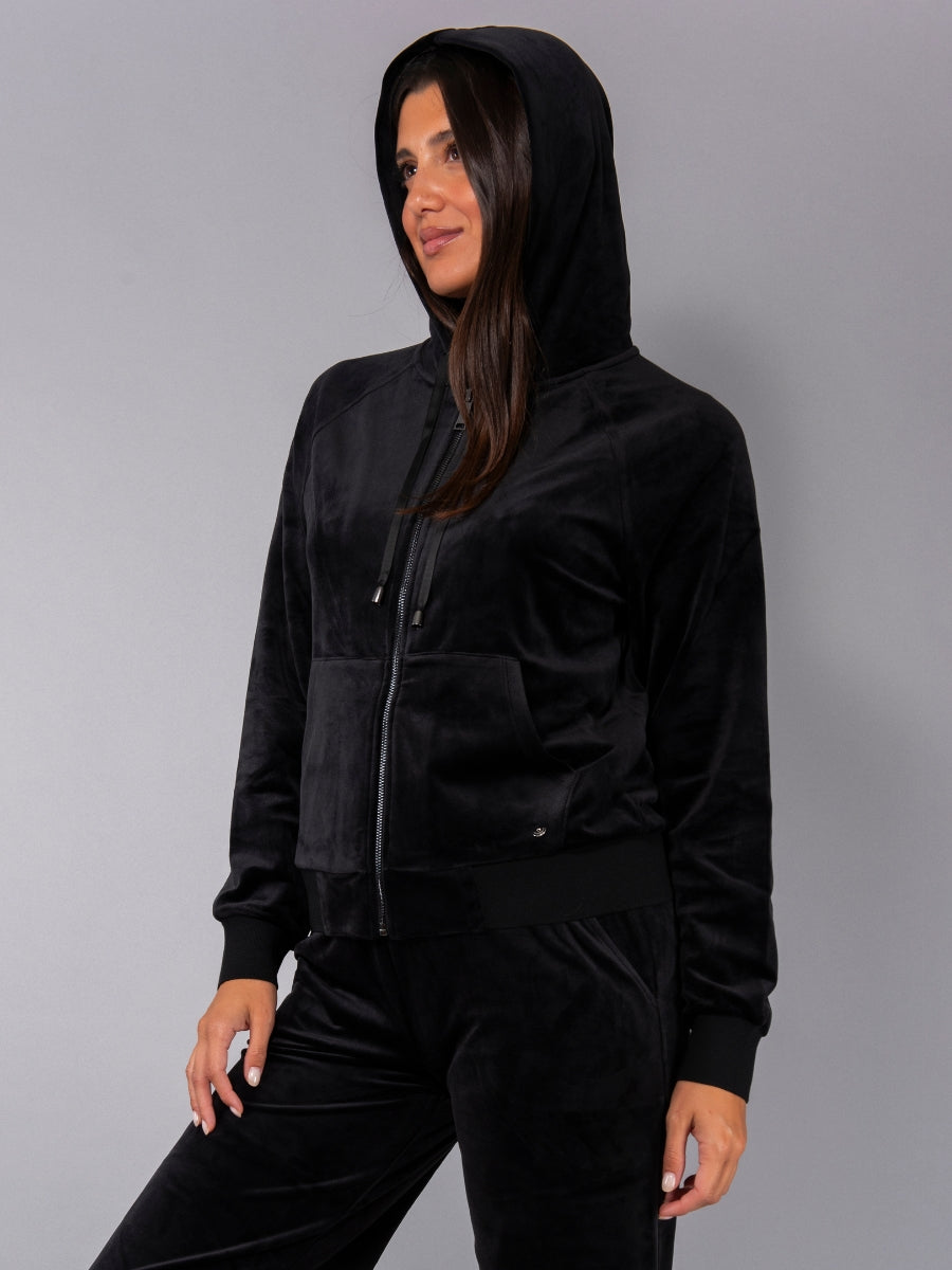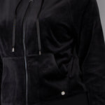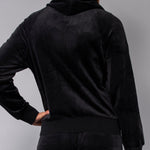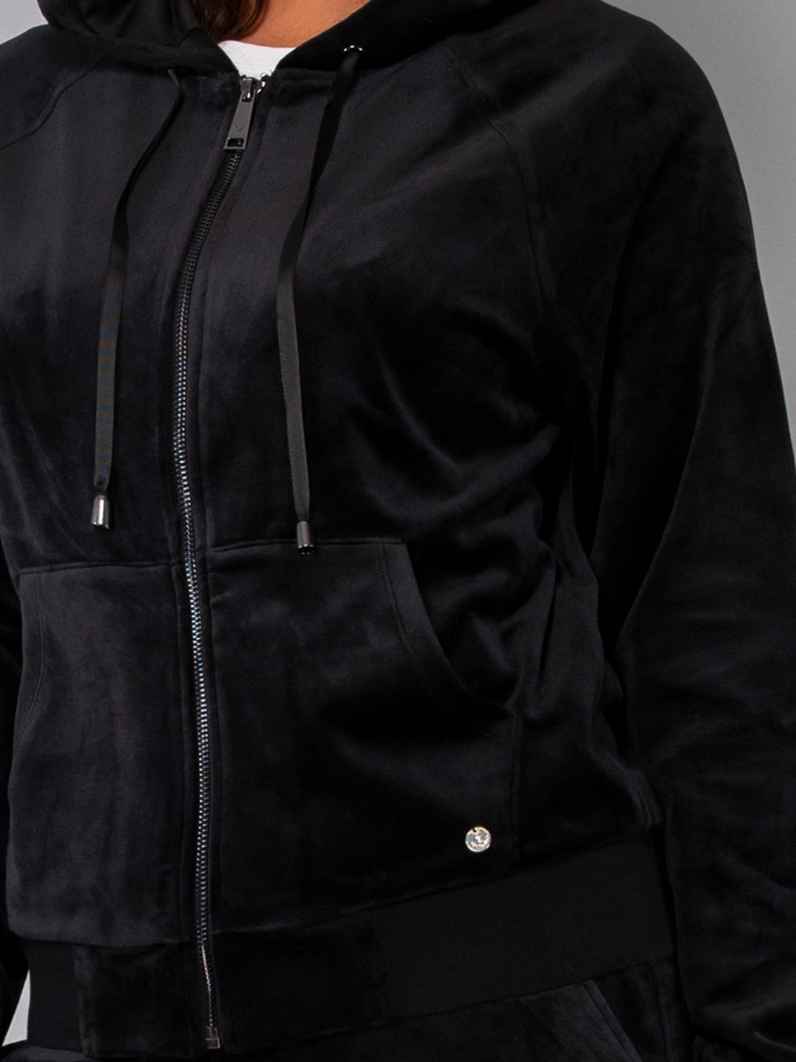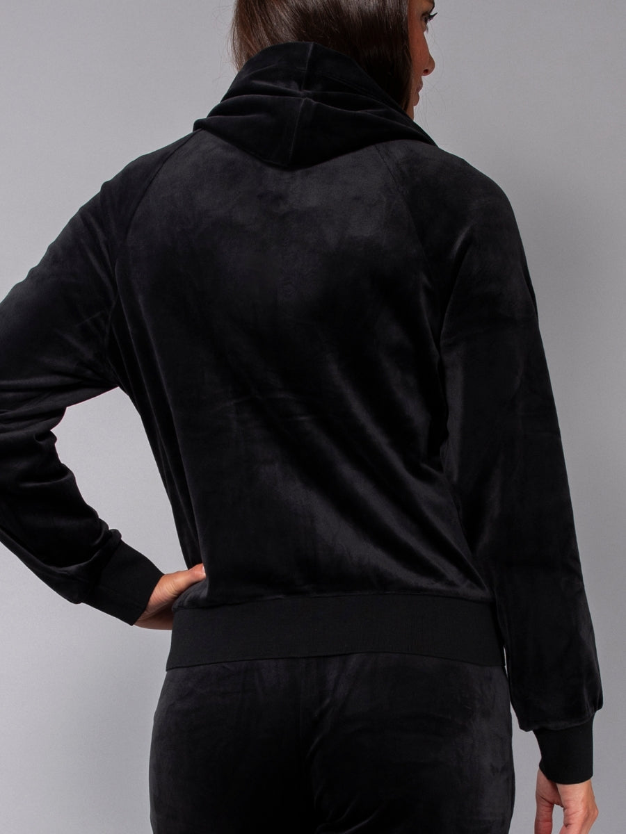 Felpa in ciniglia, morbida e scivolata, con zip, cappuccio e ampie tasche. Il capo è arricchito da una striscia di strass sulle maniche per un look sporty-chic, ideale da indossare con jogger o pantaloni palazzo in coordinato.
