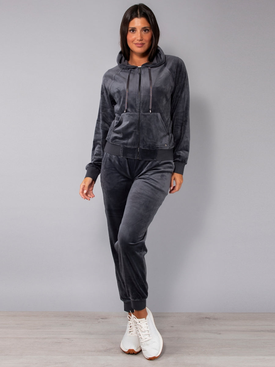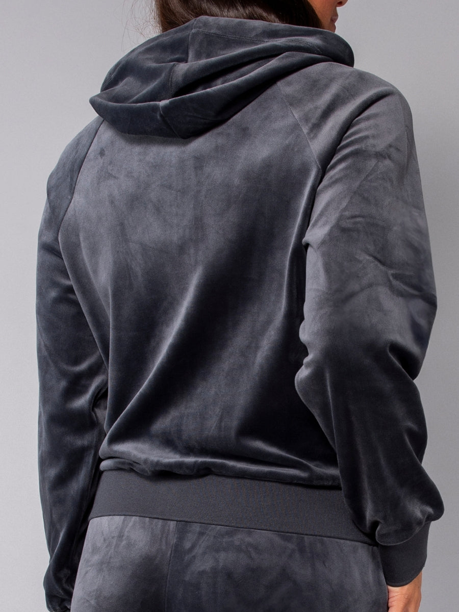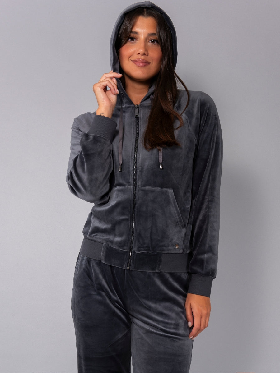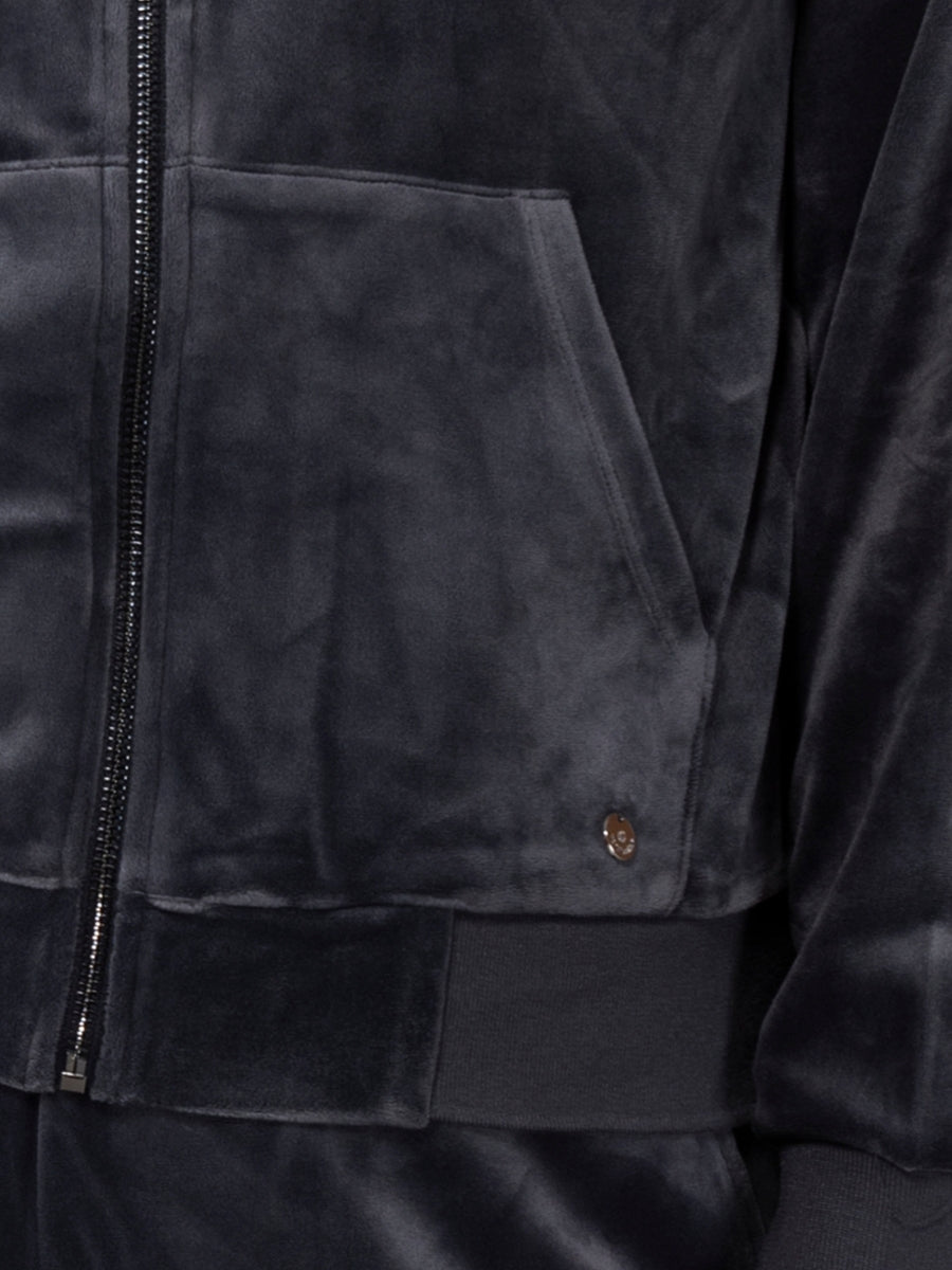 Felpa in ciniglia, morbida e scivolata, con zip, cappuccio e ampie tasche. Il capo è arricchito da una striscia di strass sulle maniche per un look sporty-chic, ideale da indossare con jogger o pantaloni palazzo in coordinato.