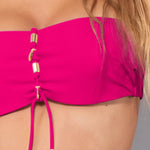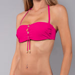 Fascia non imbottita progettata per garantire comfort e supporto alle coppe differenziate C, D, E. La struttura è dotata di ferretto invisibile che sostiene il décolleté, mentre l’assenza di imbottitura assicura una vestibilità comoda e naturale. Allacciatura sul retro con gancio e spalline removibili. Il design del costume da bagno è completato dal accessori gold al centroseno.