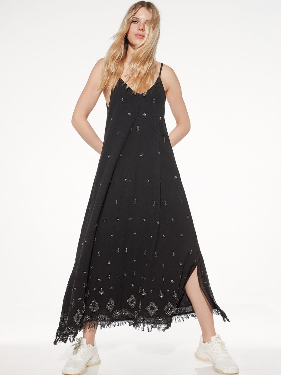 Questo abito lungo incarna lo stile boho-chic con un design moderno e dettagli preziosi. Realizzato in 100% cotone, presenta un elegante scollo a V e sottili spalline che esaltano la silhouette. I ricami, che si intensificano gradualmente verso il fondo, creano un effetto sofisticato e raffinato, mentre lo spacco discreto e il bordo con frange donano movimento e aggiungono un tocco distintivo.