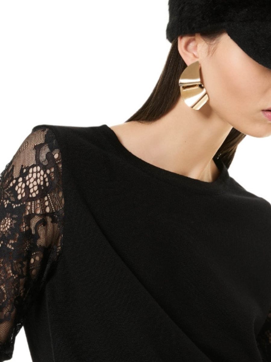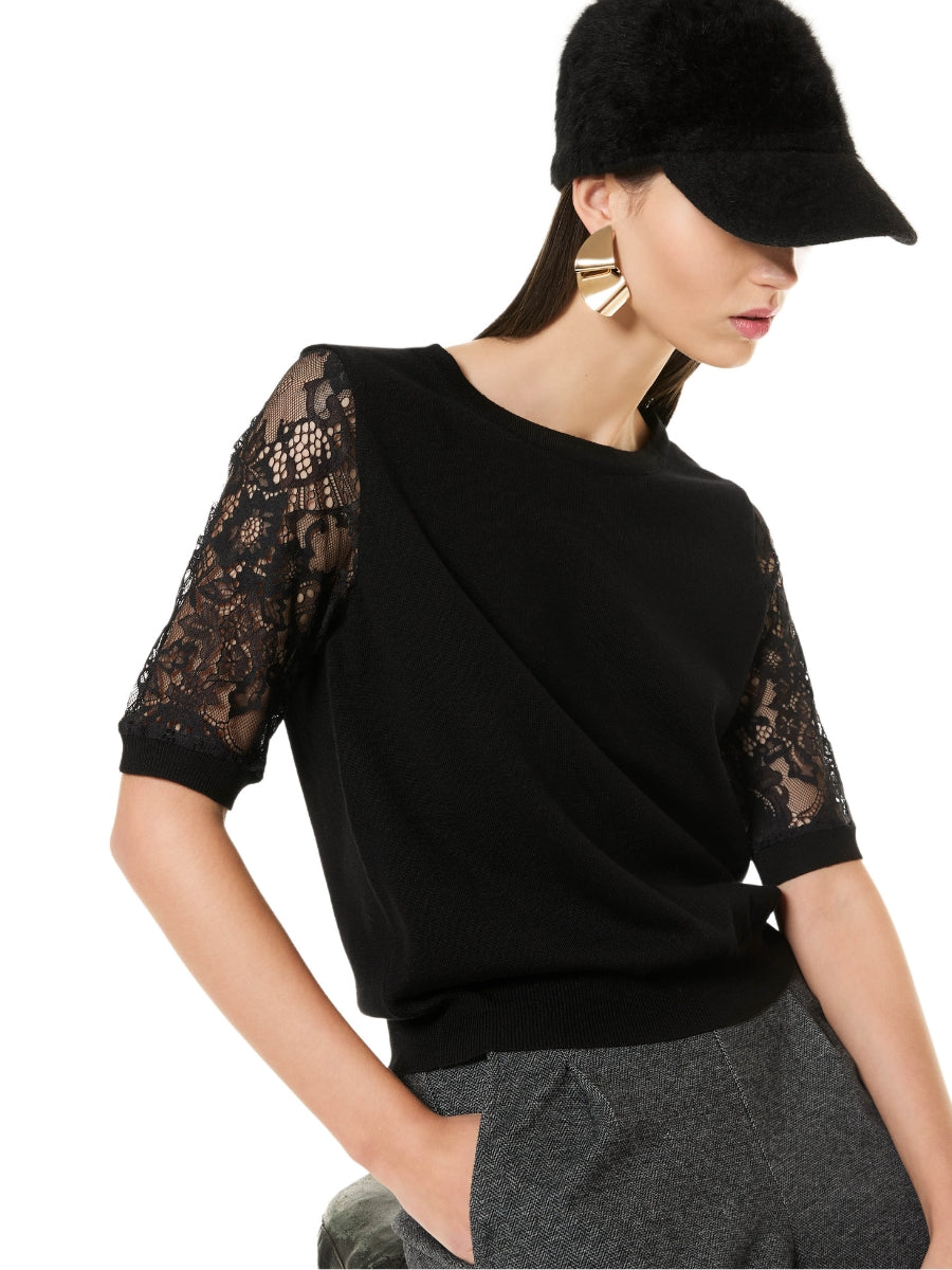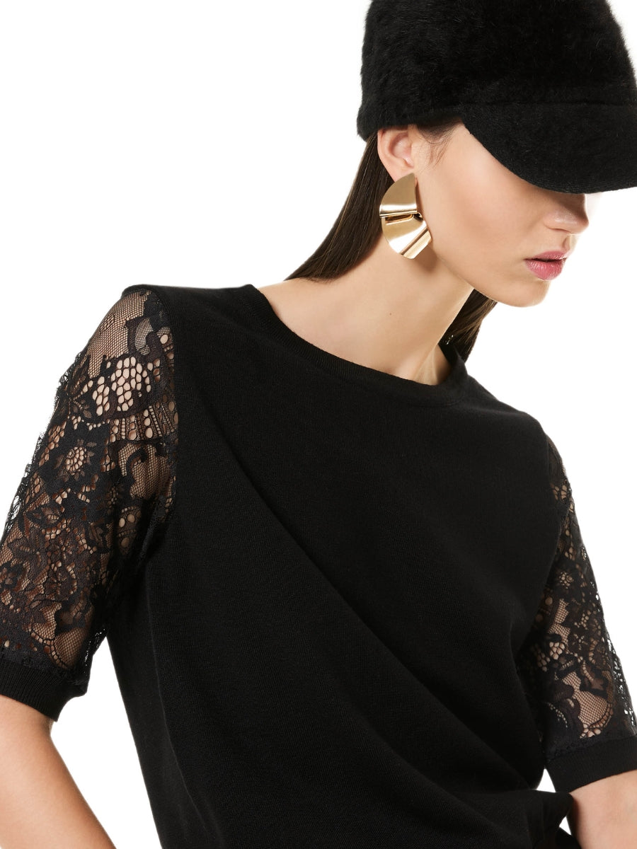 La maglia girocollo a manica corta si distingue per i dettagli in pizzo tono su tono, che impreziosiscono il design con eleganza discreta. Realizzata in morbida viscosa, è il capo ideale per look femminili e sofisticati.