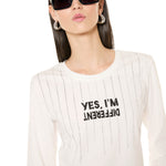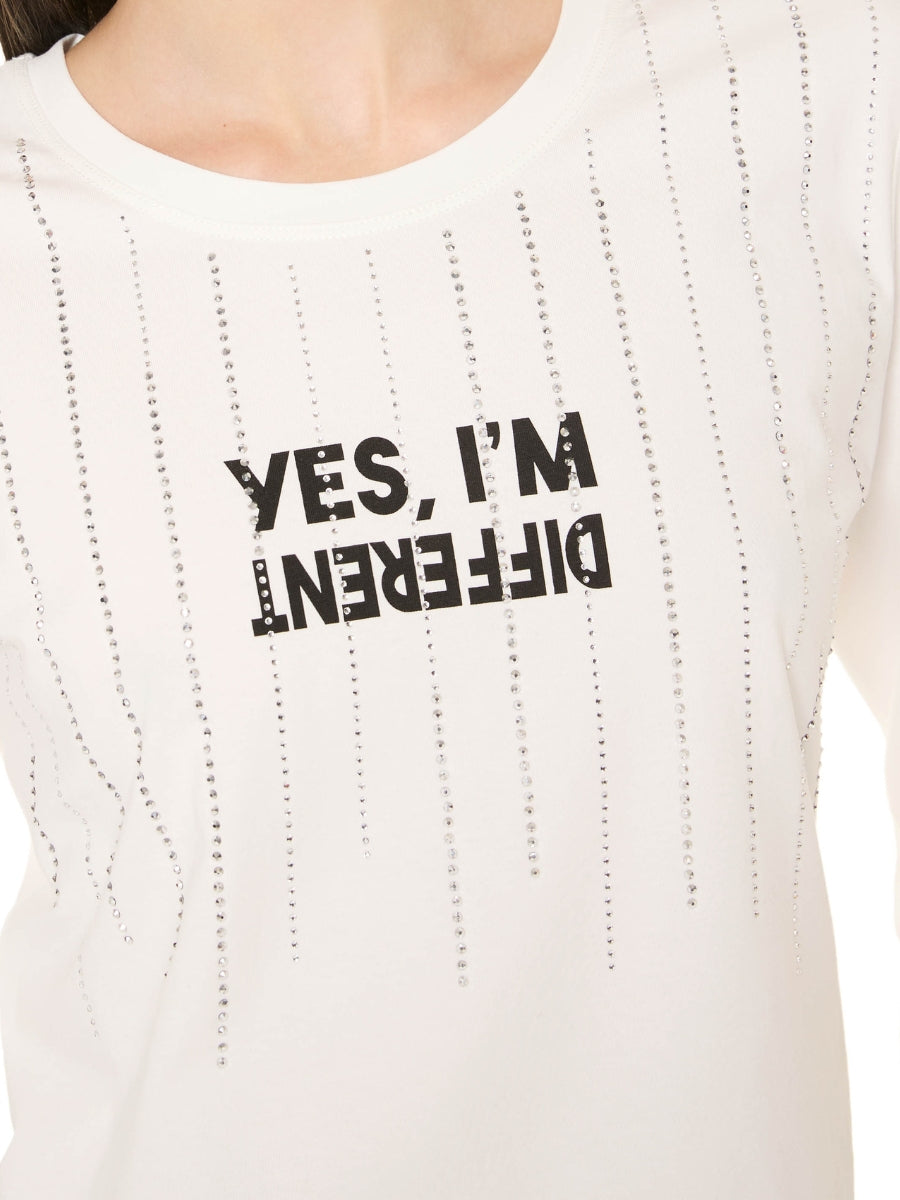 La maglia a manica lunga in cotone si distingue per la stampa frontale e per i piccoli strass applicati, che donano un tocco brillante e contemporaneo al design. Il tessuto in cotone garantisce comfort e praticità per l’uso quotidiano.