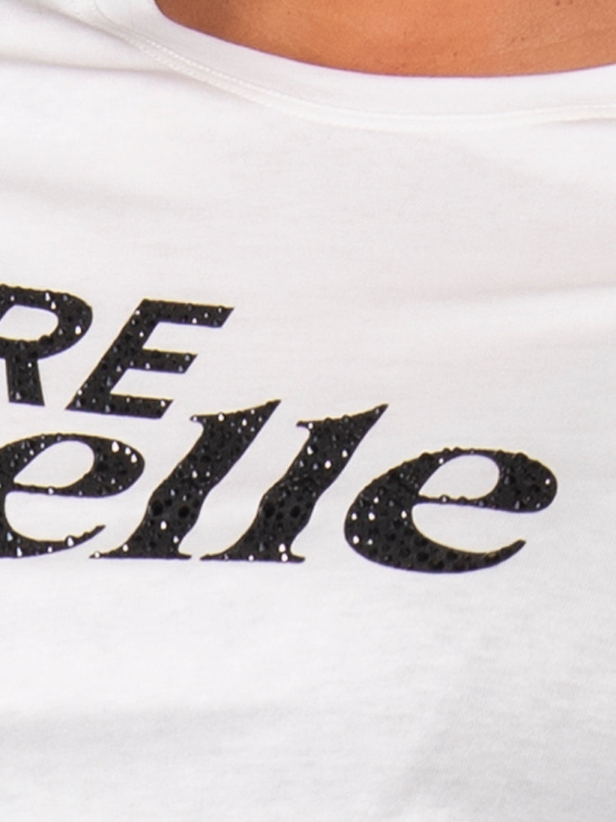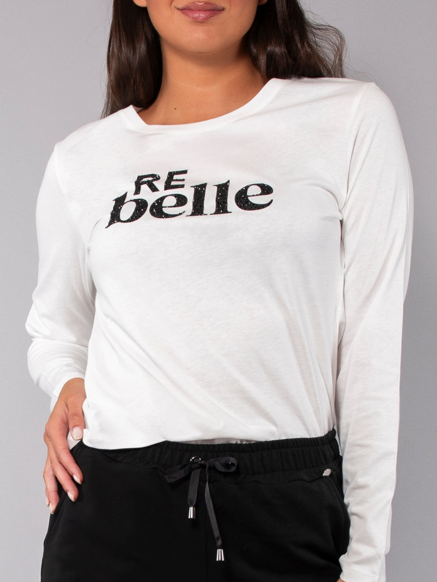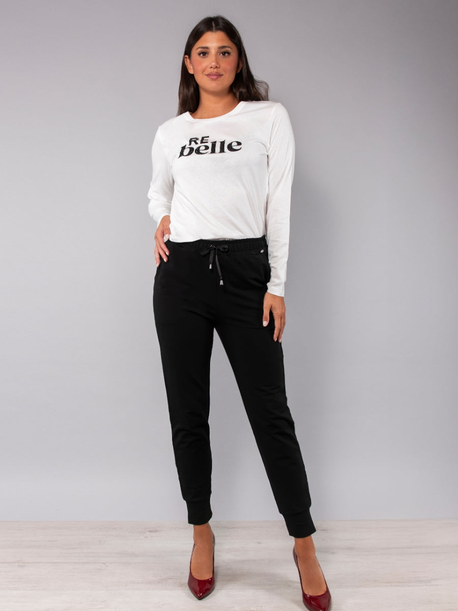 La maglia a manica lunga in cotone si distingue per la stampa frontale arricchita da strass tono su tono, che donano un tocco luminoso e contemporaneo al design. Il tessuto in cotone garantisce comfort e praticità per l’uso quotidiano.