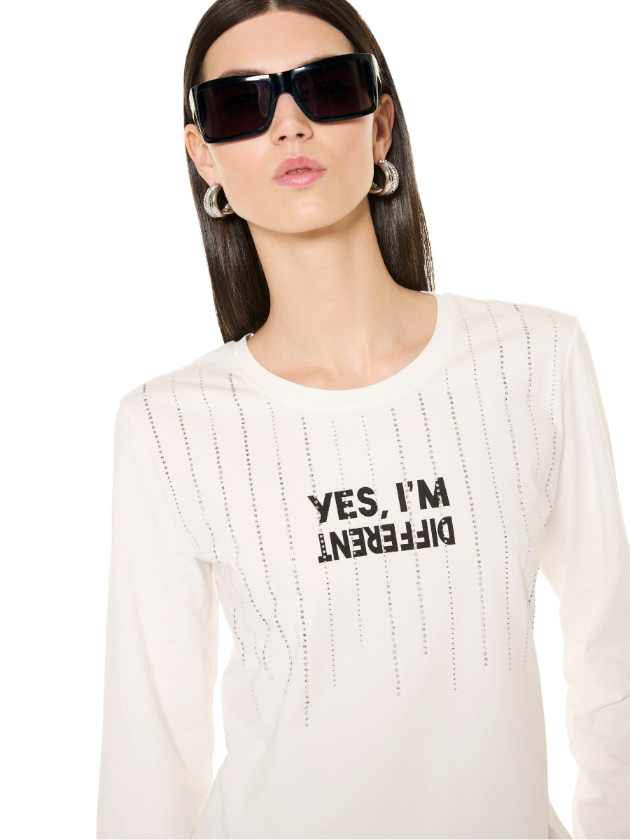 La maglia a manica lunga in cotone si distingue per la stampa frontale e per i piccoli strass applicati, che donano un tocco brillante e contemporaneo al design. Il tessuto in cotone garantisce comfort e praticità per l’uso quotidiano.