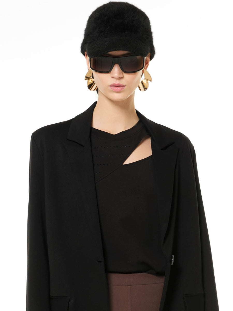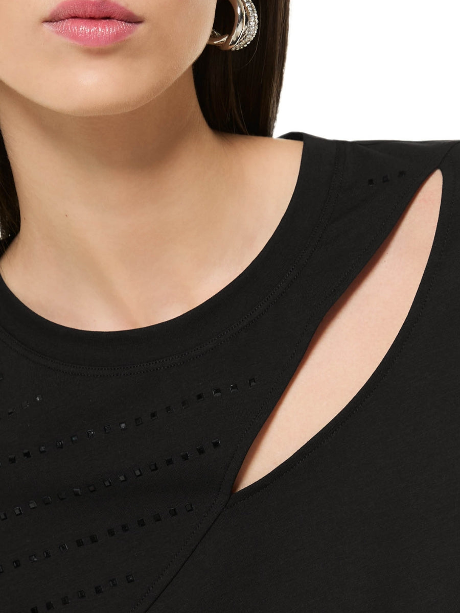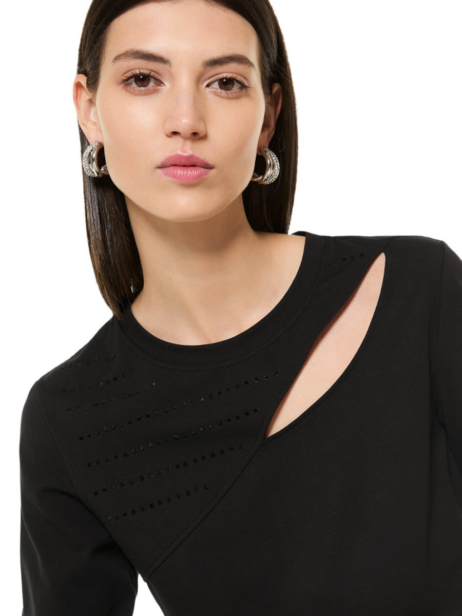 La maglia a maniche lunghe in cotone si distingue per il cut-out frontale arricchito da strass tono su tono, che impreziosiscono il capo con un tocco luminoso e sofisticato. Un dettaglio originale che rende la maglia perfetta per chi ama distinguersi con stile.