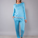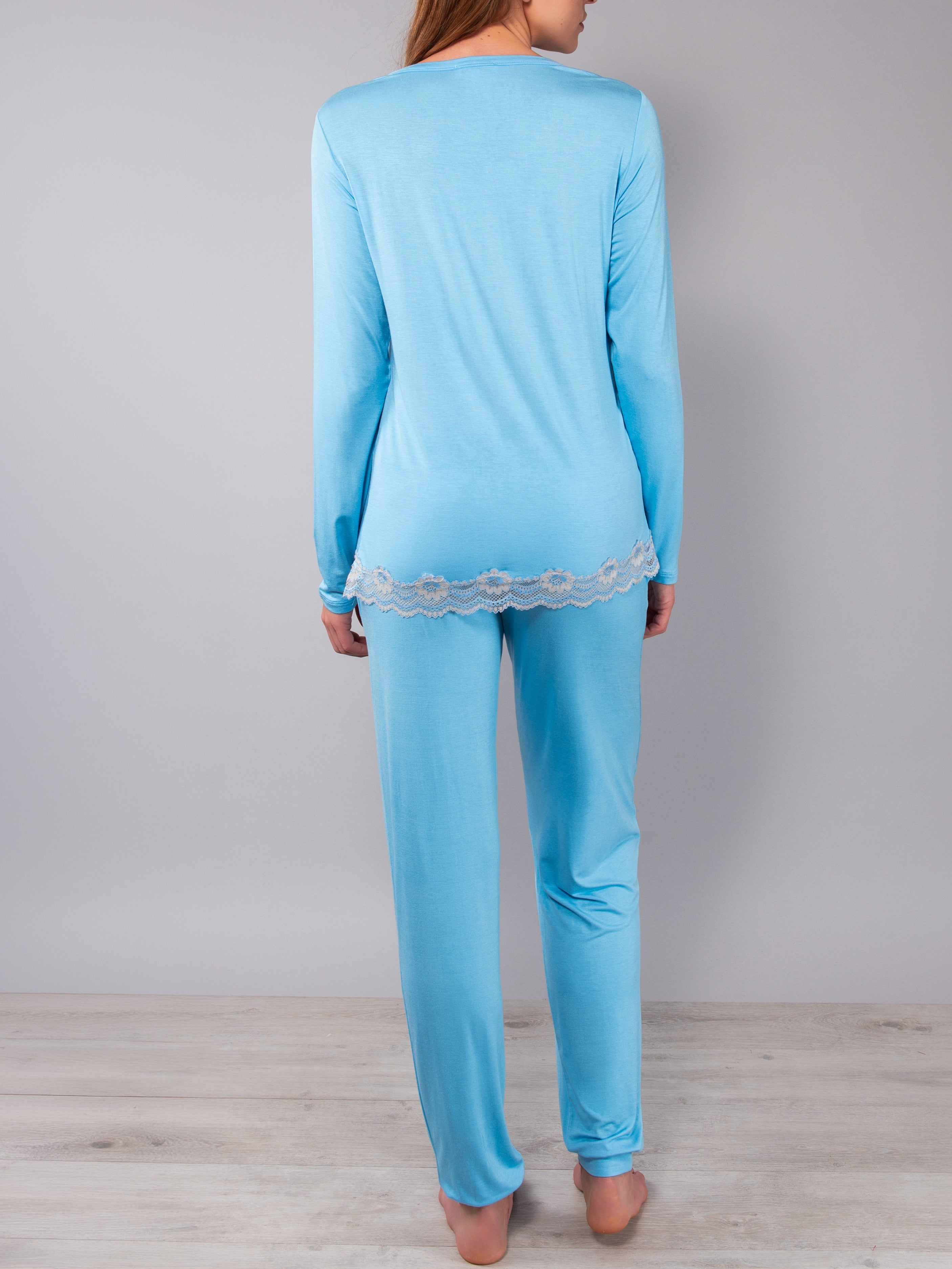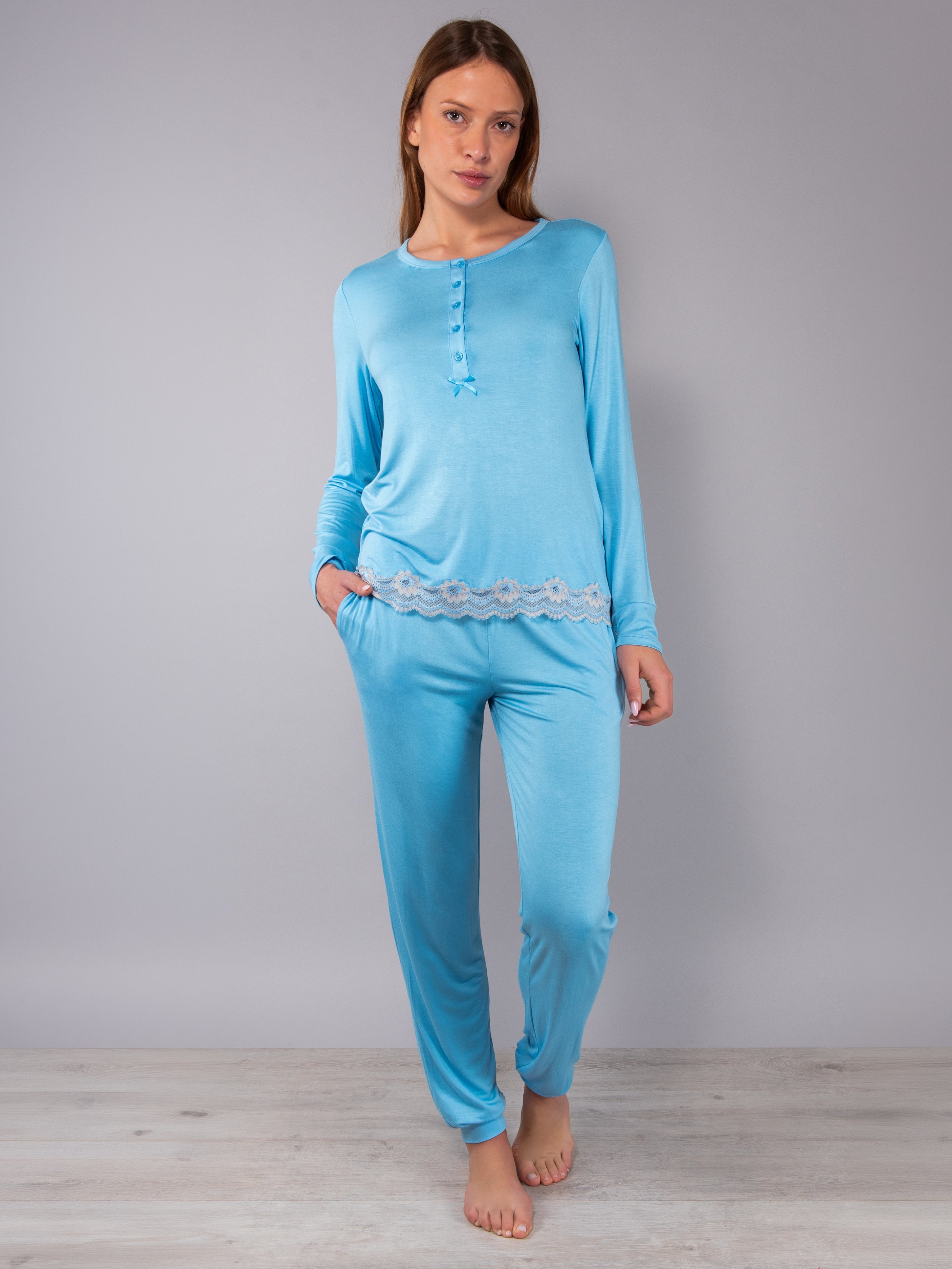 Pigiama lungo realizzato in morbida viscosa con inserti in pizzo tono su tono lungo le bordature. Il set è composto da una maglia serafino a manica lunga e un pantalone lungo coordinato con tasche e polsini, dotato di vita elasticizzata per una vestibilità pratica e confortevole.