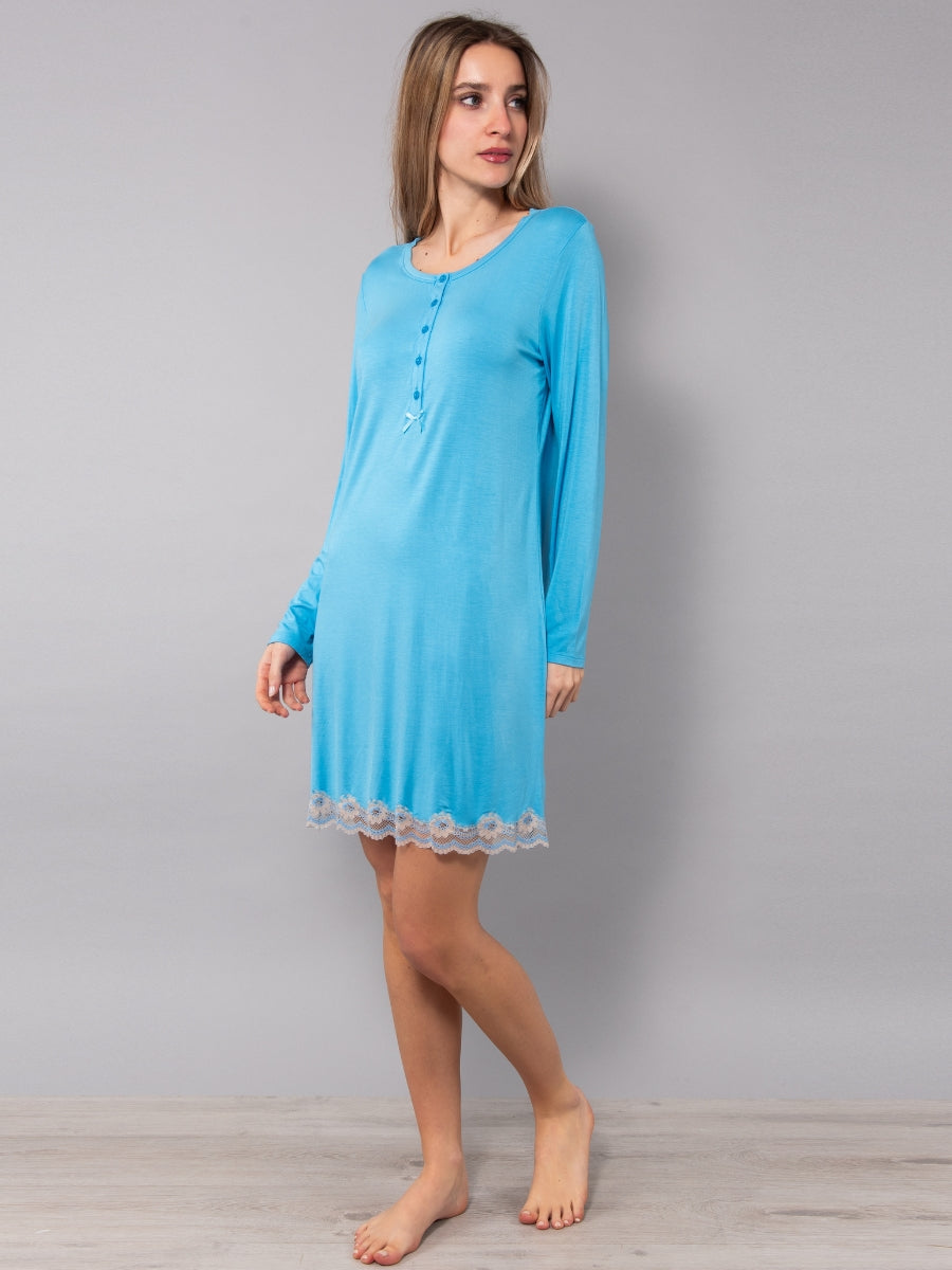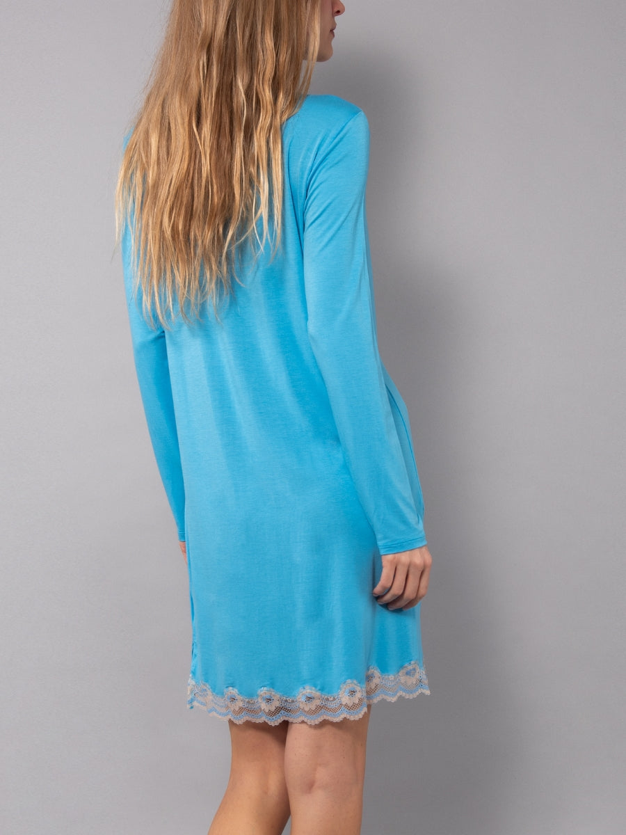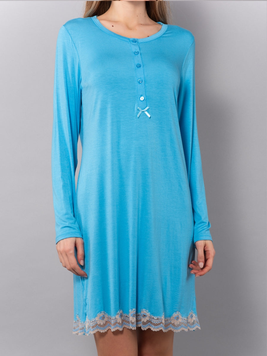 Camicia da notte realizzata in morbida viscosa con inserti in pizzo tono su tono lungo le bordature. Il modello presenta una linea fluida ed essenziale con scollo serafino e manica lunga, che garantisce una vestibilità pratica e confortevole.