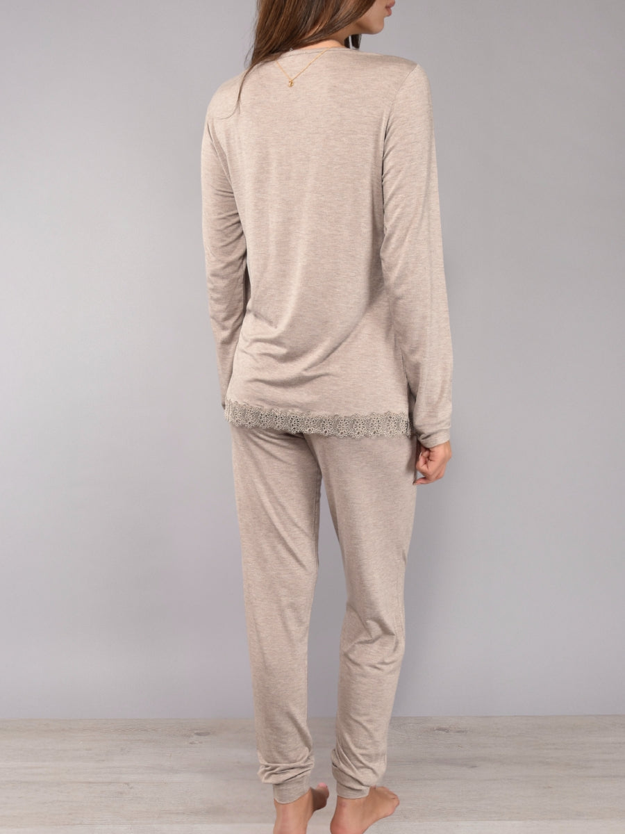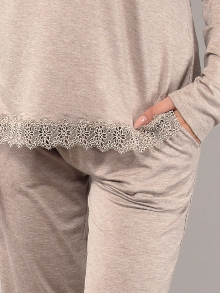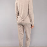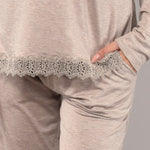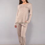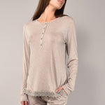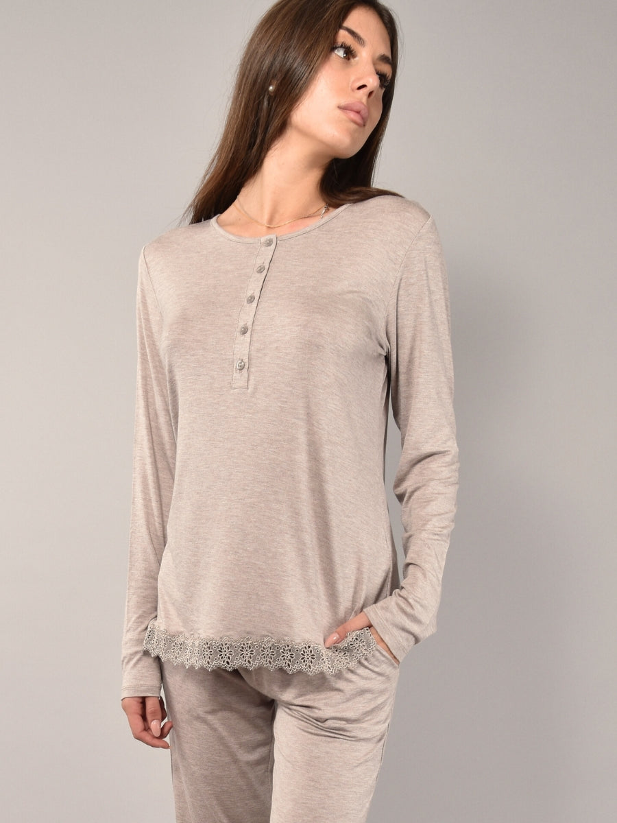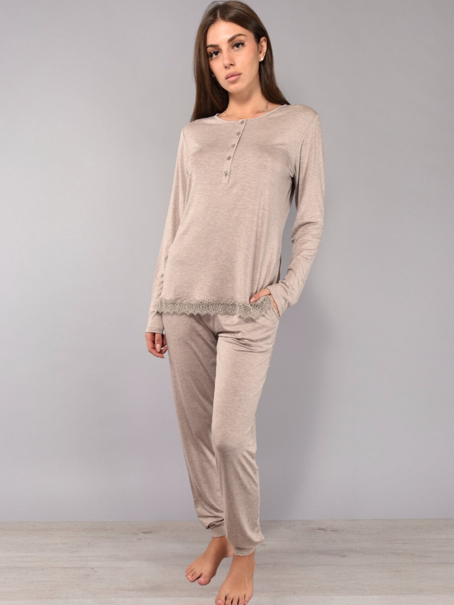 Pigiama in morbida viscosa che unisce comfort e stile raffinato. La maglia serafino a cinque bottoni è impreziosita da delicati dettagli in pizzo macramè, mentre il pantalone lungo presenta polsino e tasche. Modello pratico e confortevole, ideale per chi desidera un capo notte semplice ma con un tocco elegante. Disponibile nelle nuance tortora, salvia e grigio, perfette da abbinare alla corsetteria coordinata.