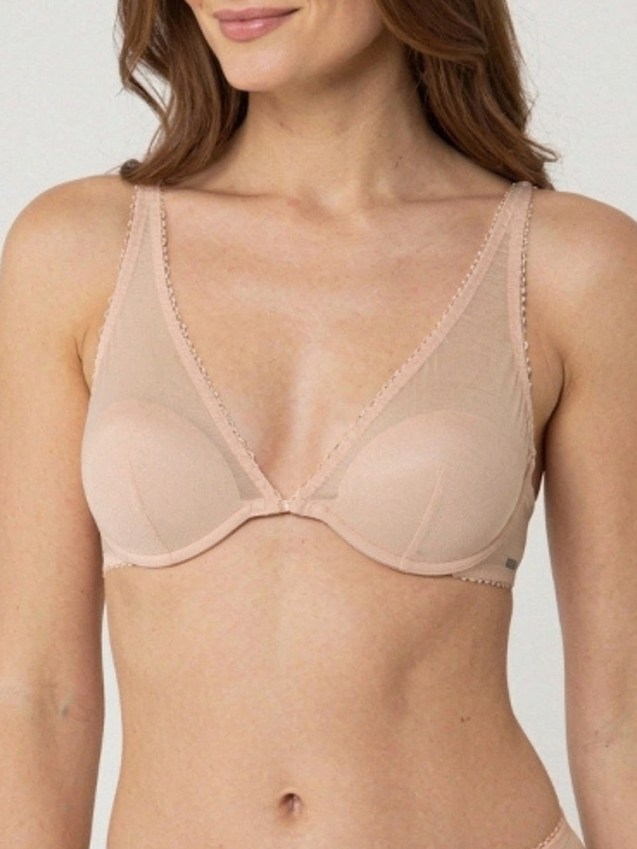 La bralette con coppe imbottite e ferretto combina un design moderno a un sostegno elevato. L'imbottitura valorizza il décolleté, mentre il tulle trasparente si estende verso le spalline creando un elegante gioco di trasparenze che assicura una vestibilità impeccabile e confortevole, ideale per l'uso quotidiano.
