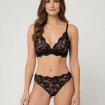 Realizzato in un pizzo floreale ricco dal tratto grafico e raffinato, questo modello si distingue per la sua forte personalità. Le linee pulite e la palette di colori vibranti esprimono una femminilità contemporanea e sofisticata. Ideale da coordinare con le diverse parti basse della collezione per un look completo e di carattere.