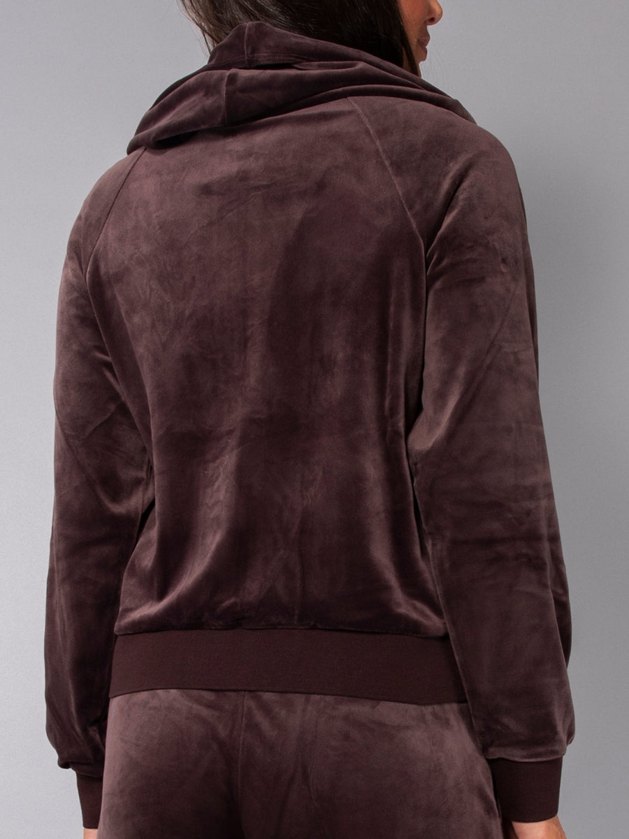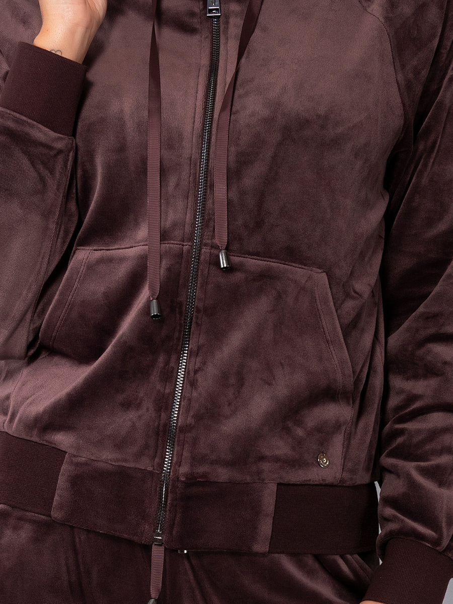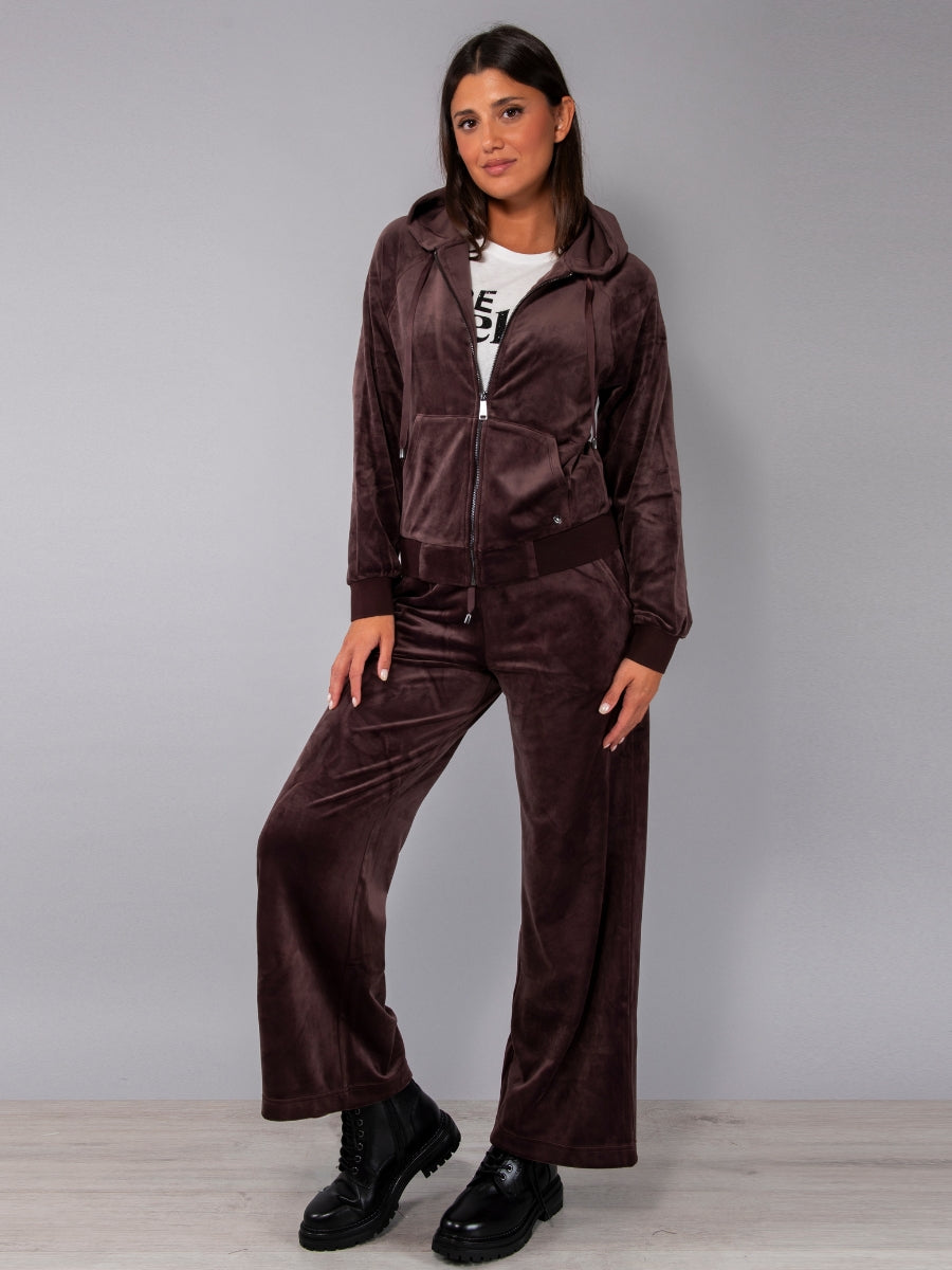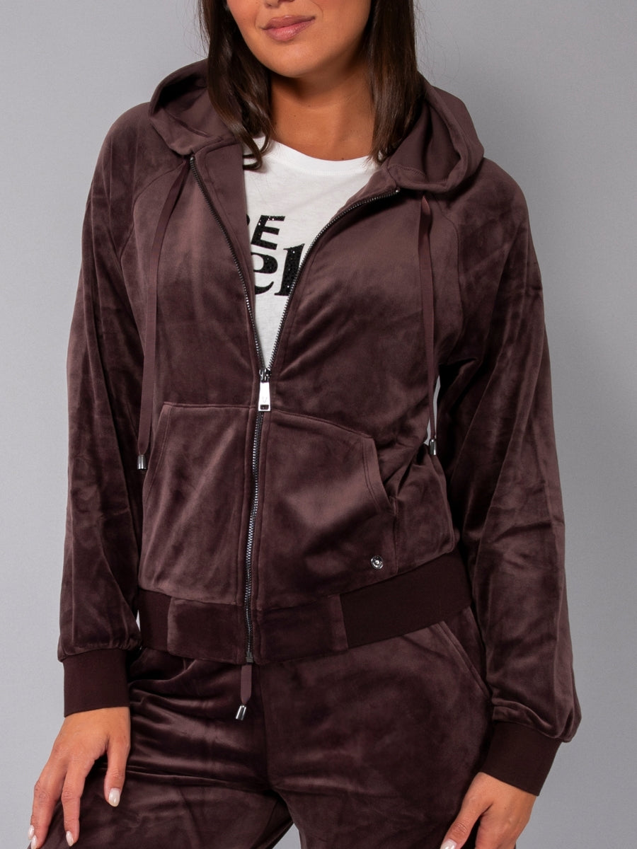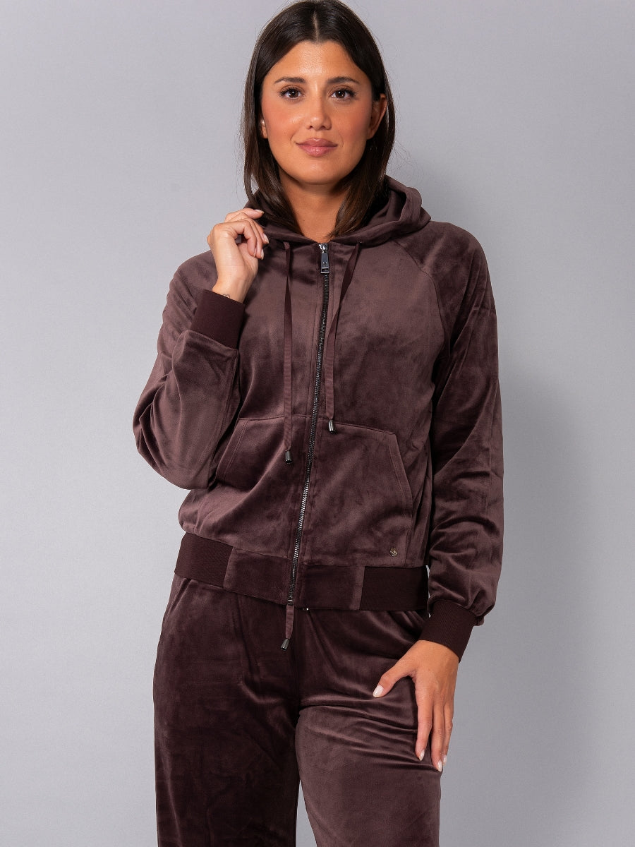 Felpa in ciniglia, morbida e scivolata, con zip, cappuccio e ampie tasche. Il capo è arricchito da una striscia di strass sulle maniche per un look sporty-chic, ideale da indossare con jogger o pantaloni palazzo in coordinato.