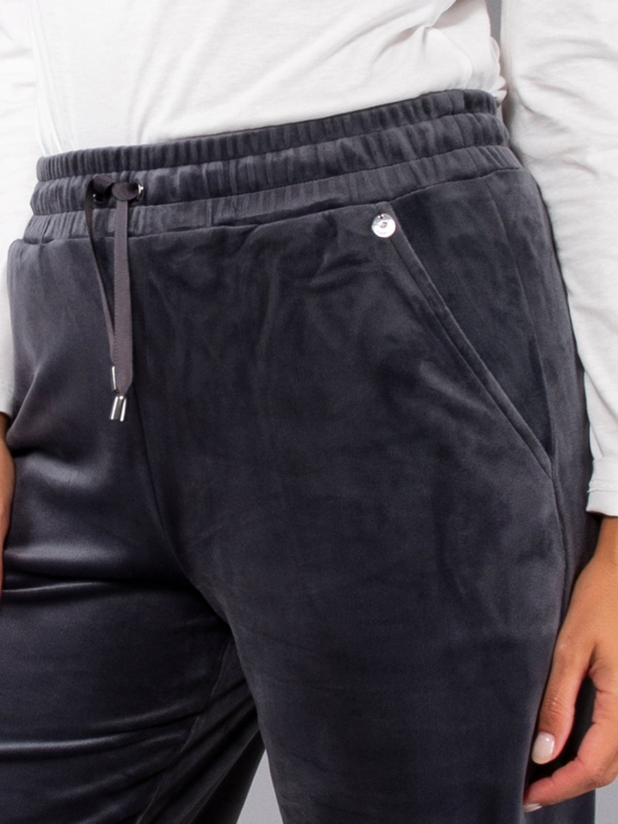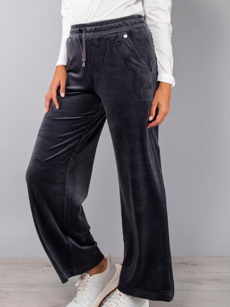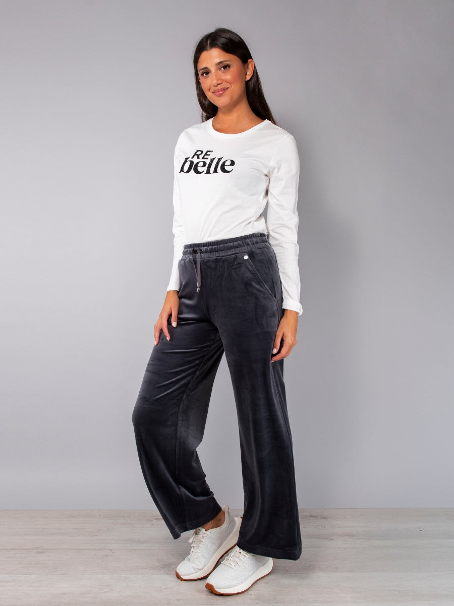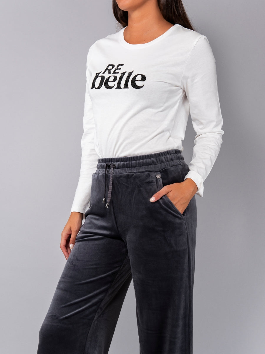 Pantaloni a gamba larga in ciniglia, morbida e scivolata, con tasche e strass. Il capo è perfetto per creare un look sporty-chic, ideale da indossare con felpe e maglie in coordinato.