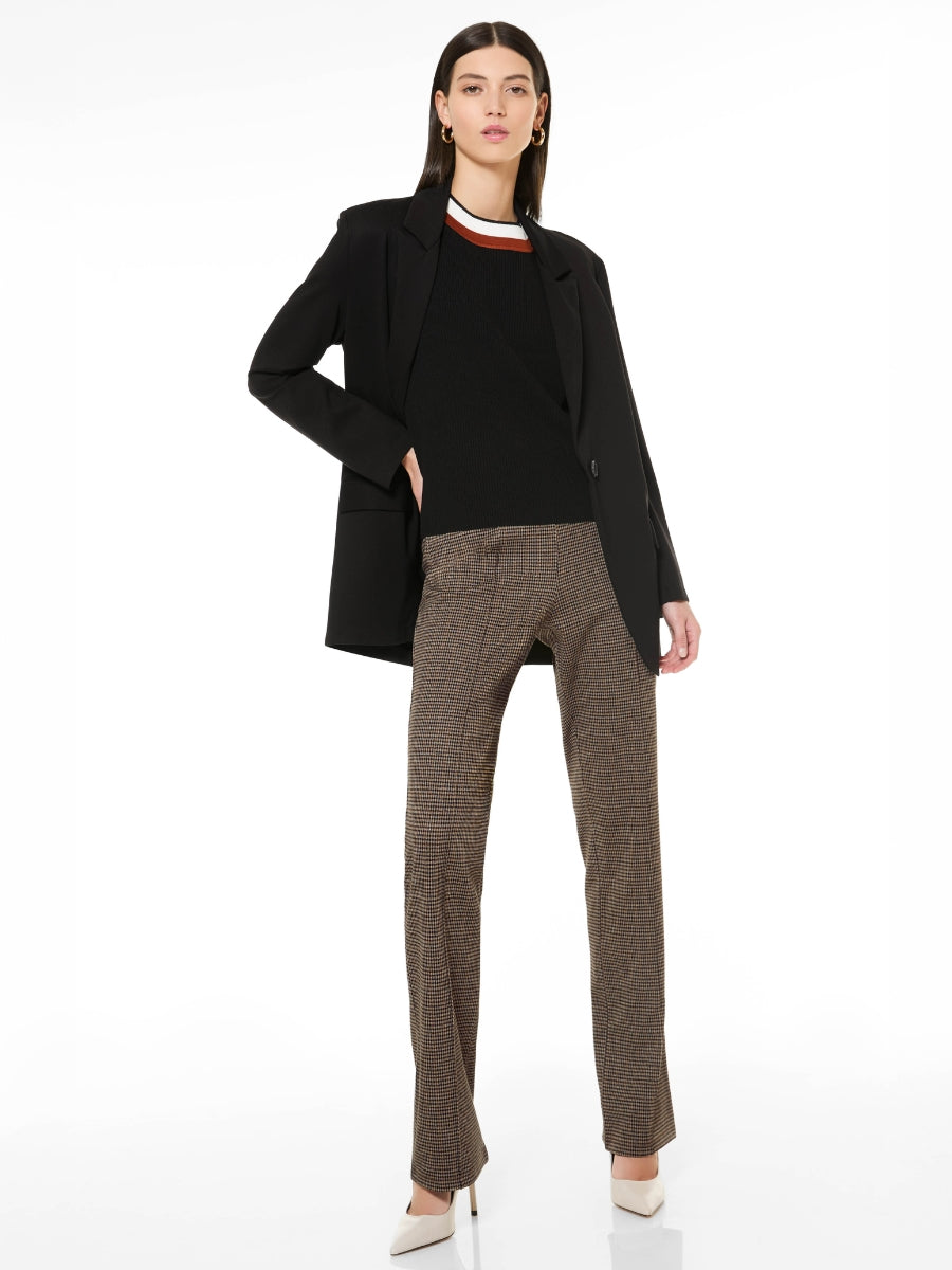 Il pantalone a gamba dritta si distingue per la raffinata fantasia check, che aggiunge carattere e personalità al tuo outfit. La vita elasticizzata garantisce una vestibilità pratica e confortevole, mentre il taglio dritto valorizza la silhouette.