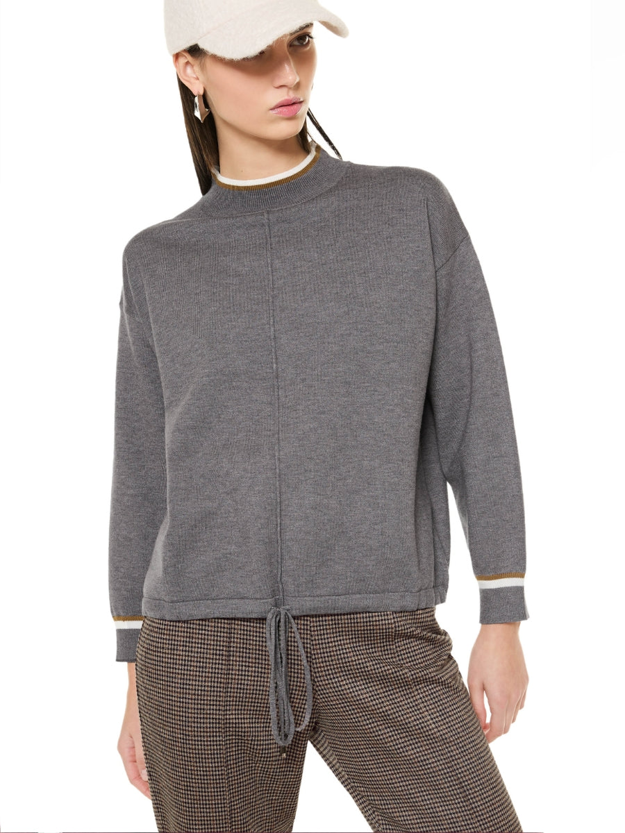 Morbida maglia a costine caratterizzata da girocollo e polsini con righe a contrasto, che definiscono un design moderno e distintivo. La coulisse regolabile in vita permette di modulare la vestibilità.