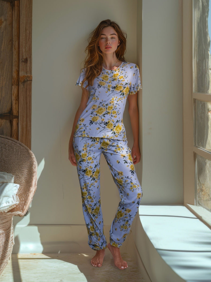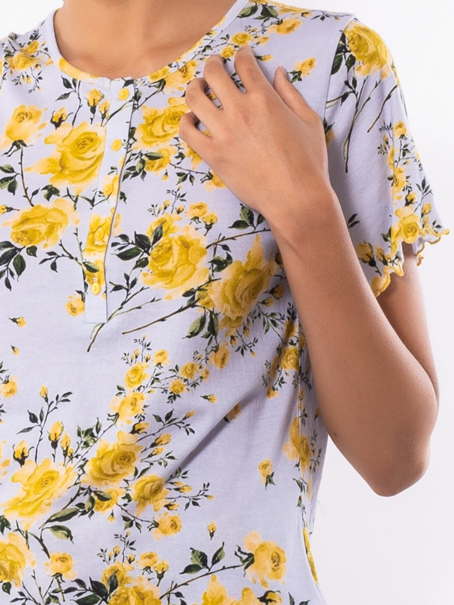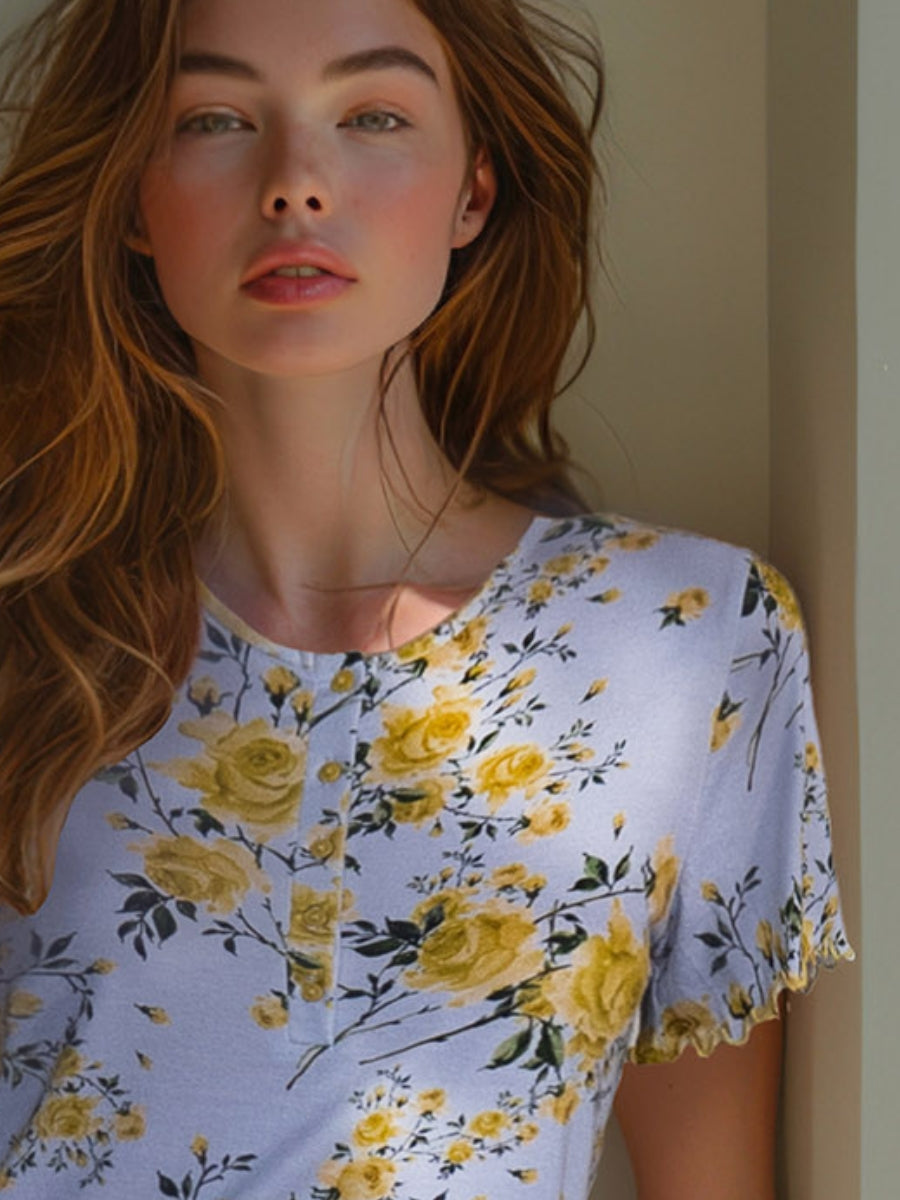 La maglia serafino, con cinque bottoni, si abbina al pantalone lungo dotato di elastico in vita, offrendo una vestibilità comoda e rilassata. La delicata stampa con rose conferisce al capo un carattere unico, aggiungendo un’allure raffinata a ogni momento di relax.