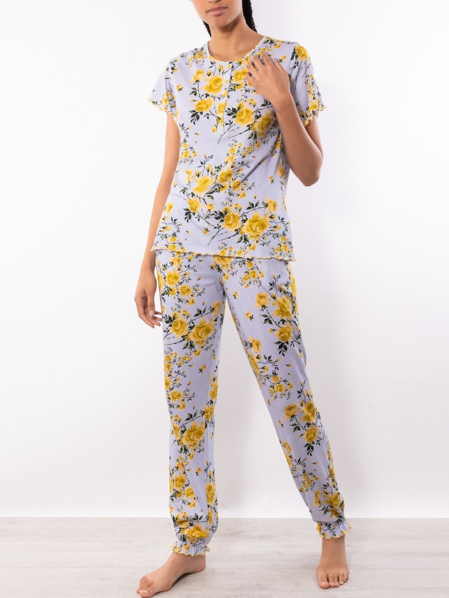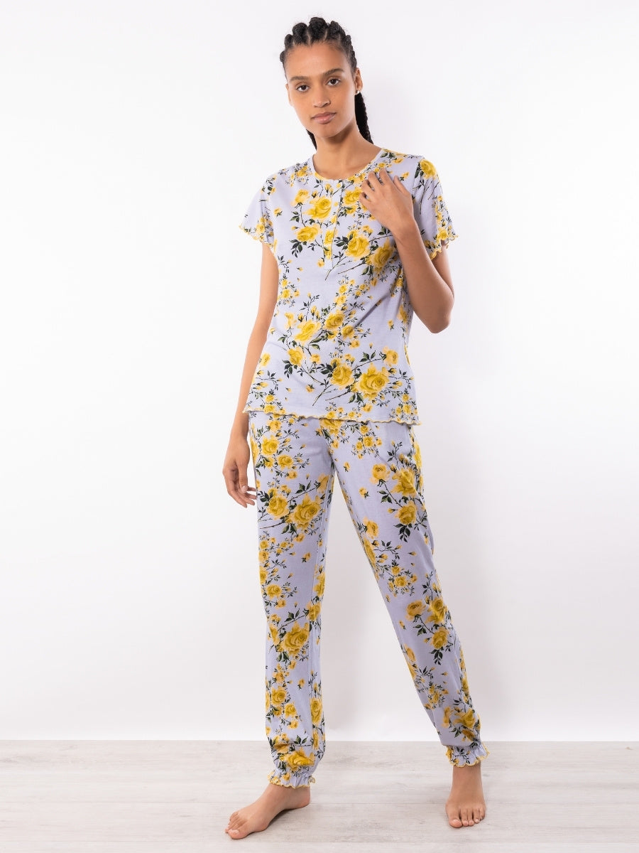 Pigiama con maglia serafino a manica corta e pantalone lungo in cotone - R011