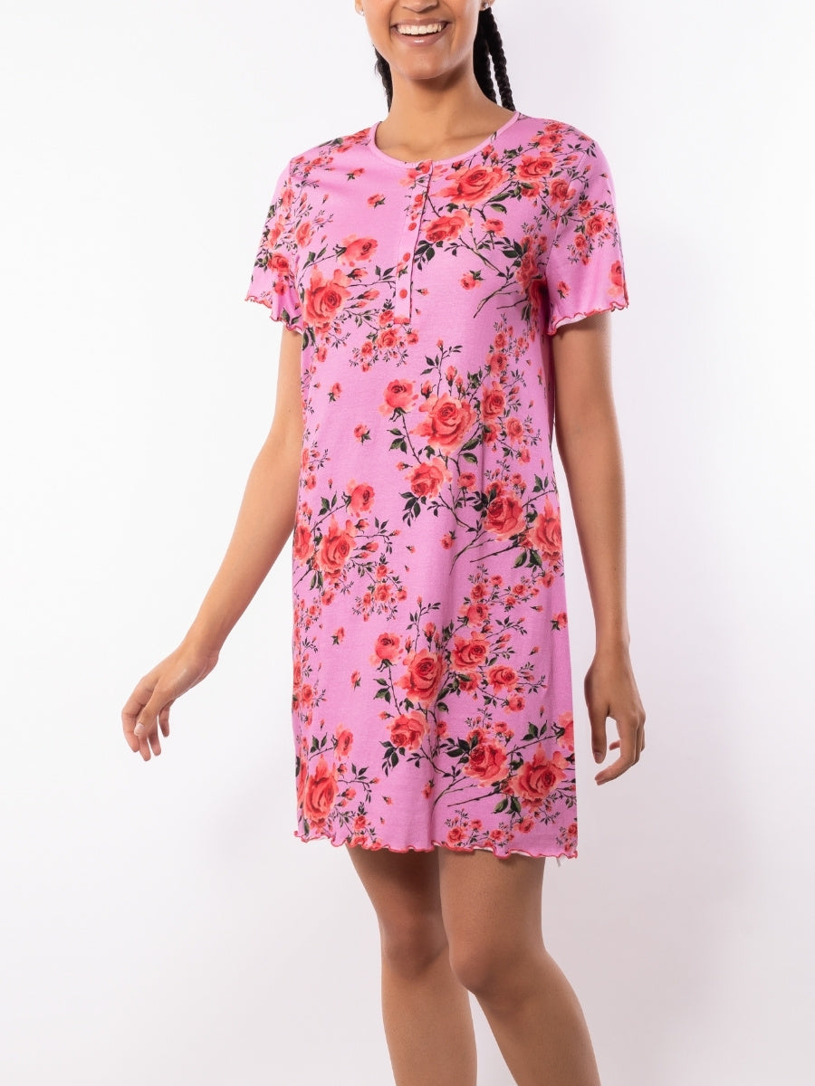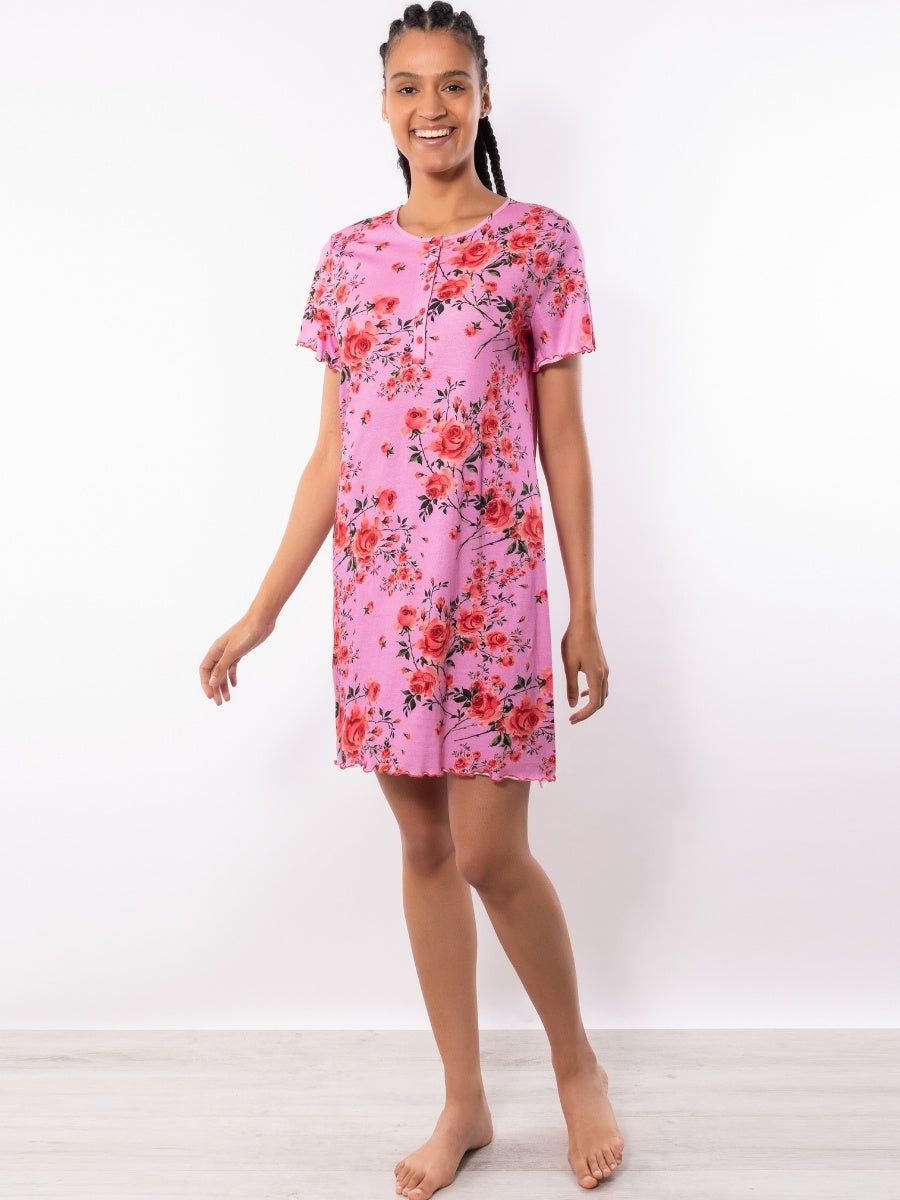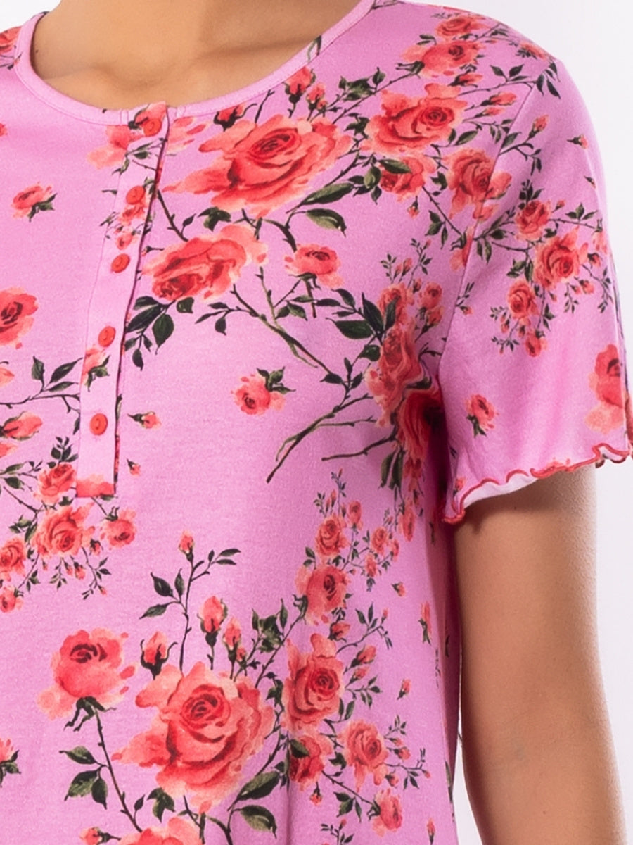 Camicia da notte da donna a manica corta con scollo serafino, realizzata in 100% cotone morbido e fresco. La stampa all-over con rose dona uno stile romantico e sognante, perfetto per chi desidera un capo notte femminile e confortevole. Il tessuto leggero la rende ideale per le notti primaverili ed estive.