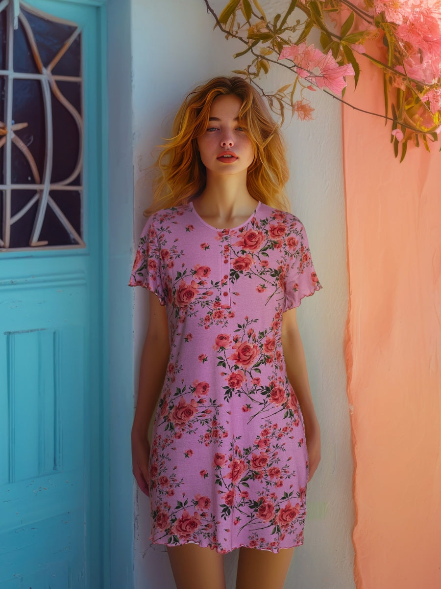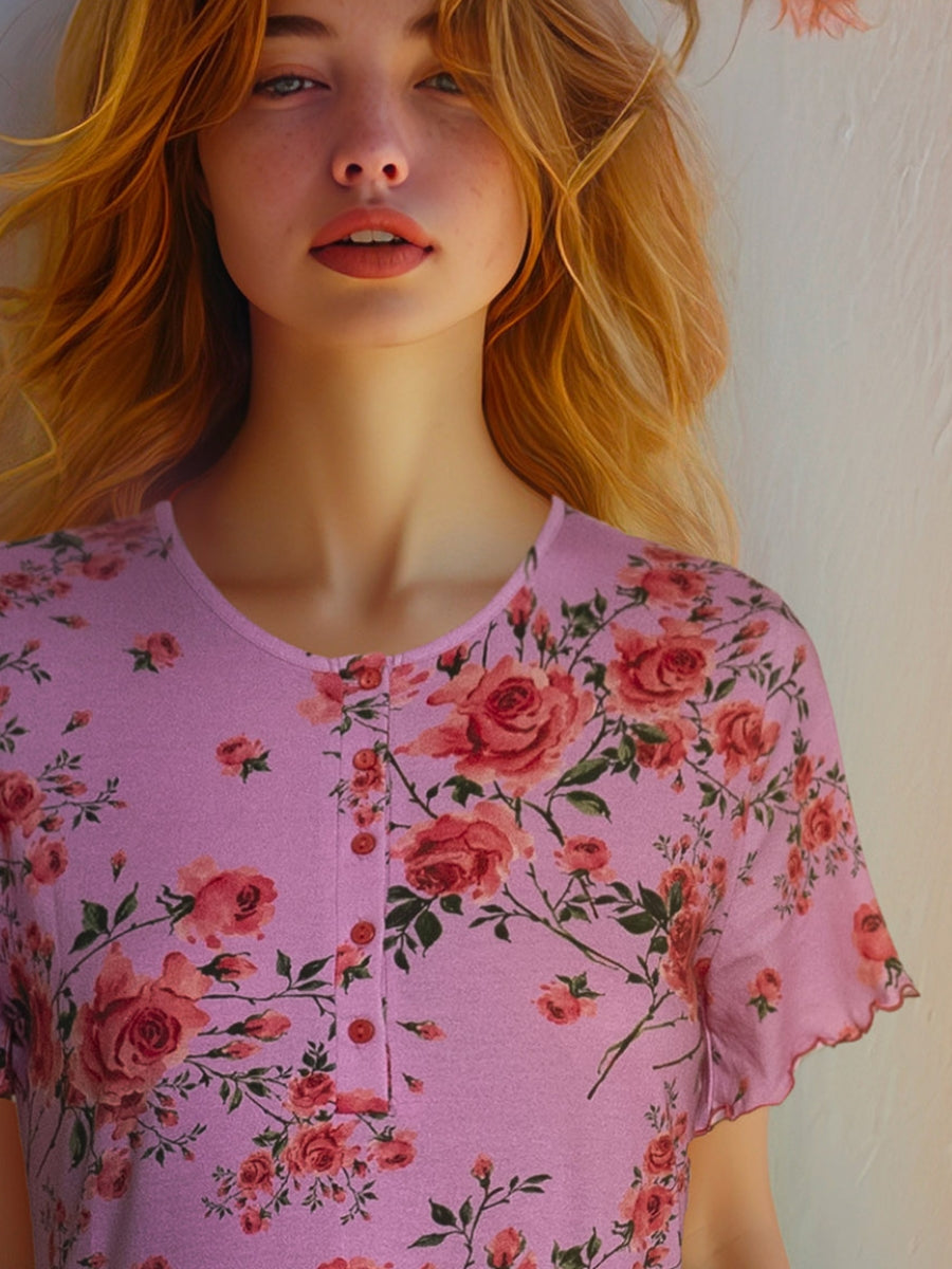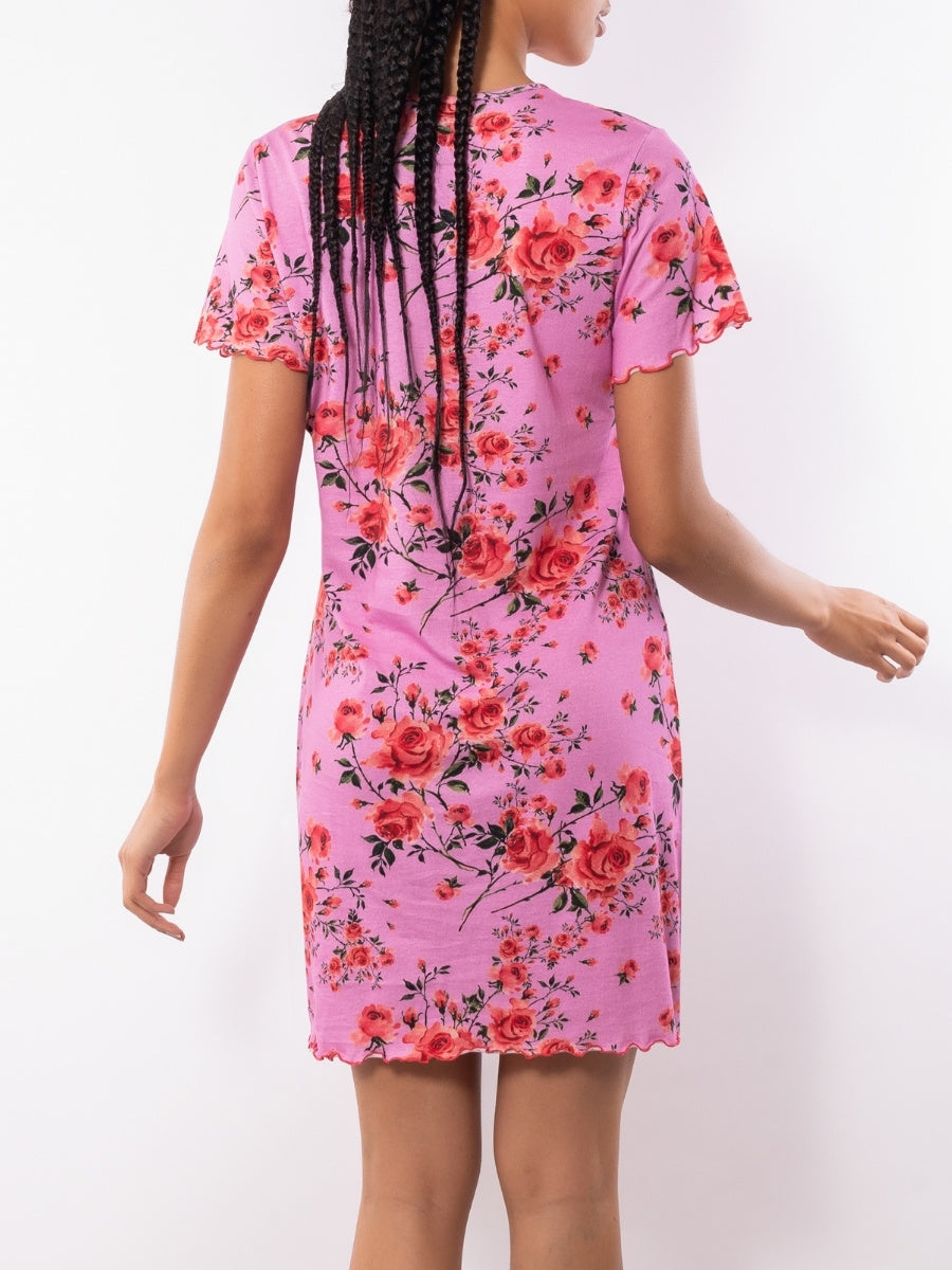Camicia da notte da donna a manica corta con scollo serafino, realizzata in 100% cotone morbido e fresco. La stampa all-over con rose dona uno stile romantico e sognante, perfetto per chi desidera un capo notte femminile e confortevole. Il tessuto leggero la rende ideale per le notti primaverili ed estive.