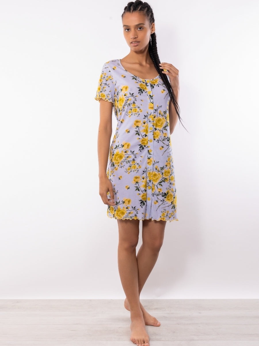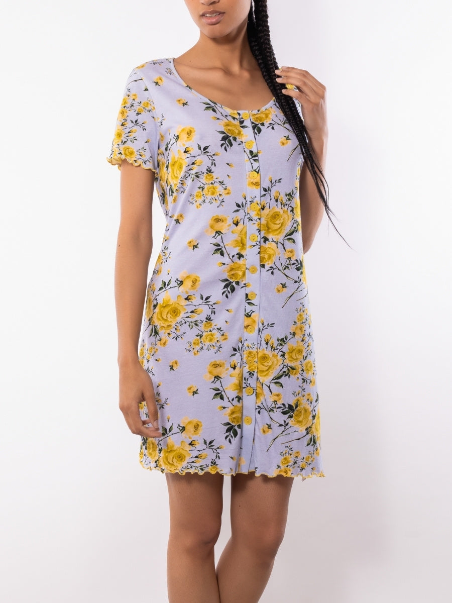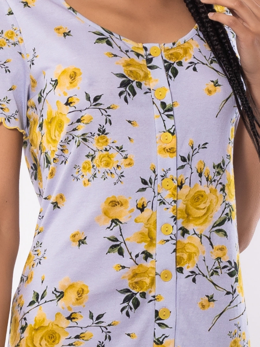 Camicia da notte da donna aperta con bottoni, scollo tondo e manica corta, realizzata in 100% cotone morbido e fresco. La stampa all-over con rose dona un tocco romantico e sognante, perfetta per chi desidera un capo notte femminile e confortevole. Il tessuto leggero è ideale per le notti primaverili ed estive.