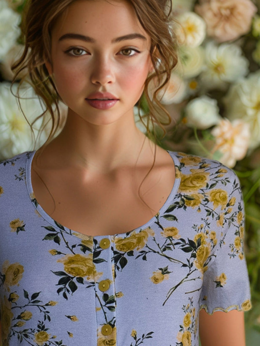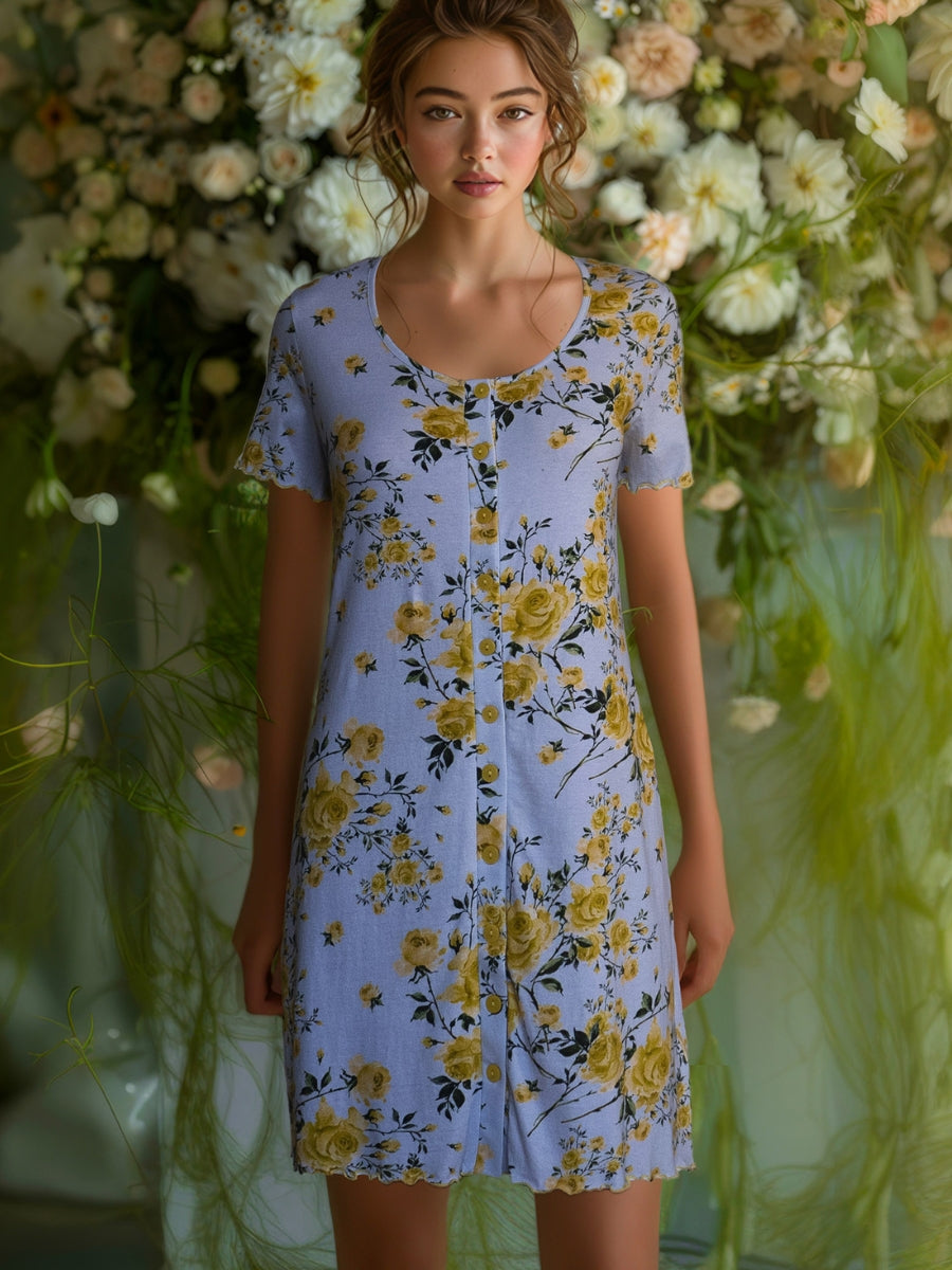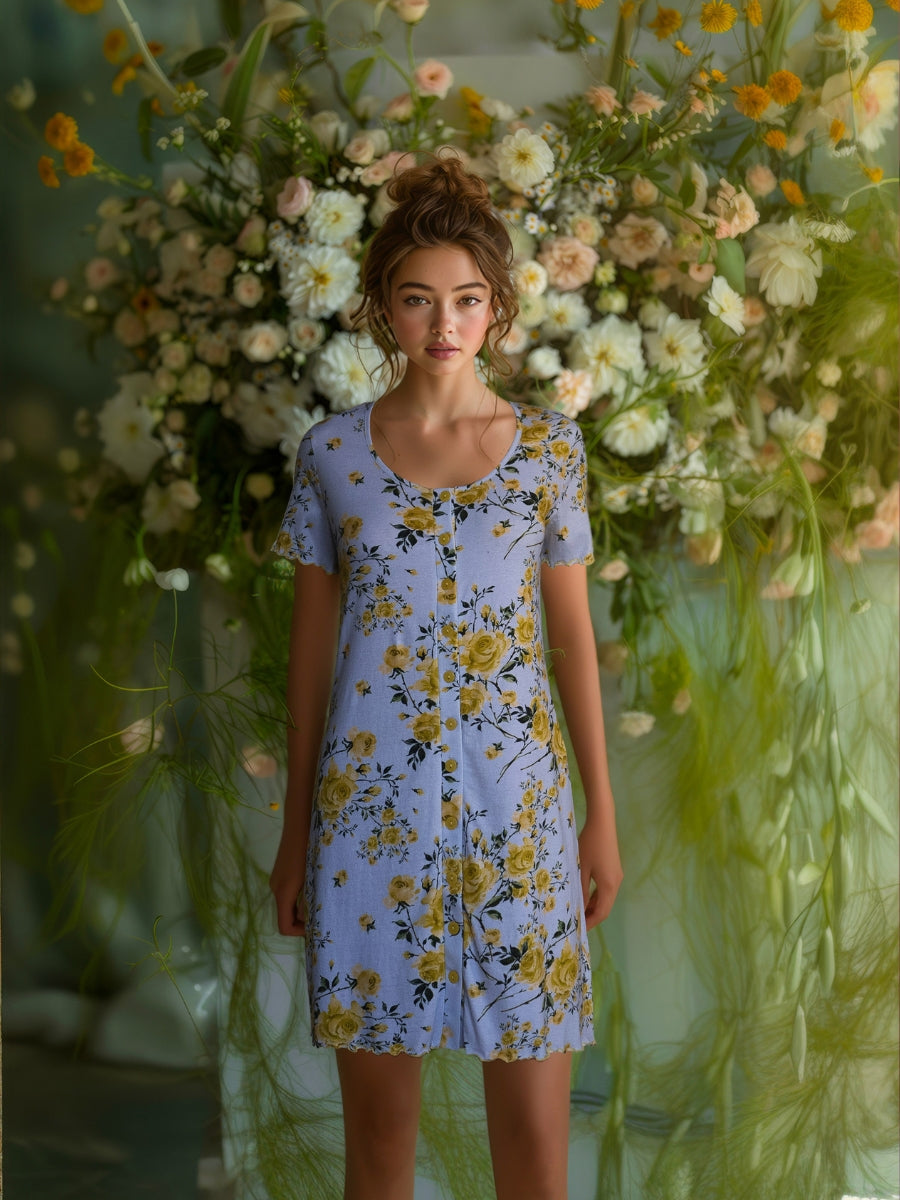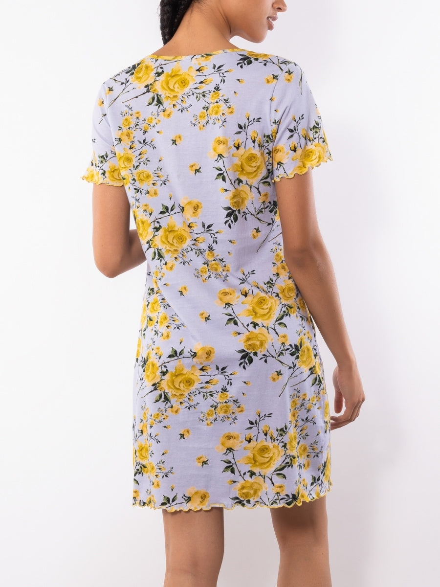 Camicia da notte da donna aperta con bottoni, scollo tondo e manica corta, realizzata in 100% cotone morbido e fresco. La stampa all-over con rose dona un tocco romantico e sognante, perfetta per chi desidera un capo notte femminile e confortevole. Il tessuto leggero è ideale per le notti primaverili ed estive.