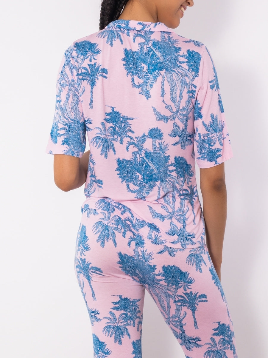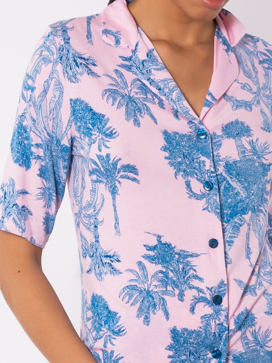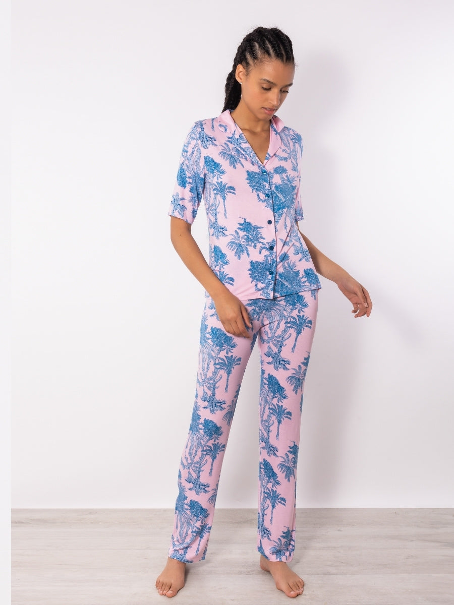 Pigiama da donna composto da camicia aperta a manica corta con collo revers e pantalone lungo con tasche, realizzato in viscosa stretch morbida e fluida. Protagonista del completo è la stampa tropicale, elegante e moderna: un pattern esclusivo che unisce stile femminile e spirito estivo.