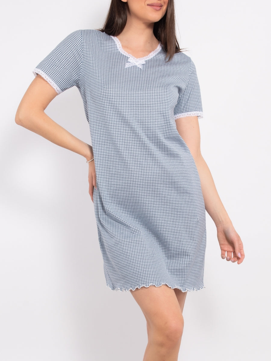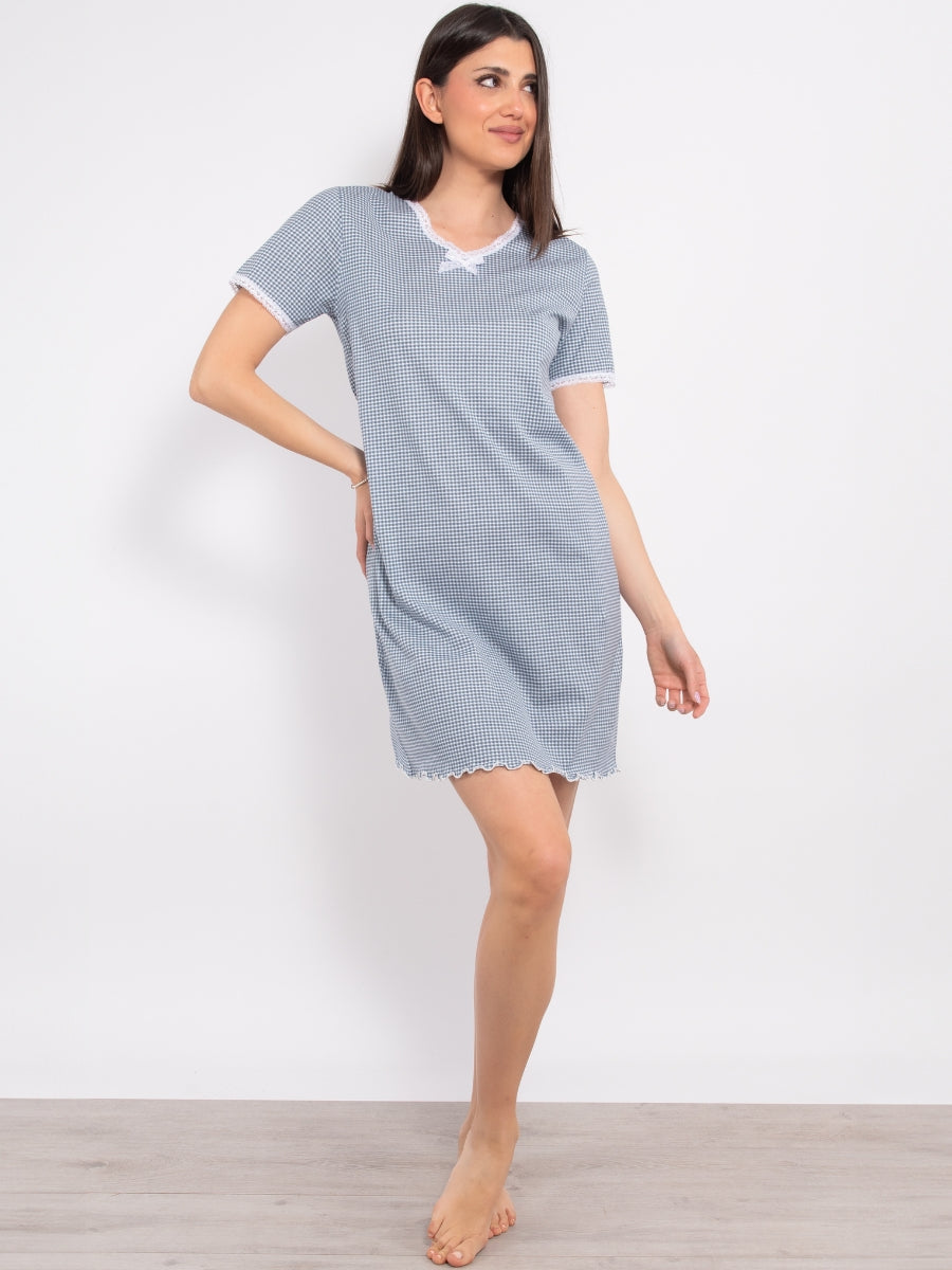Camicia da notte da donna con scollo a V, realizzata in 100% cotone, fresco e naturale. La stampa micro-vichy, reinterpretata in chiave romantica e contemporanea, regala un tocco femminile e senza tempo.