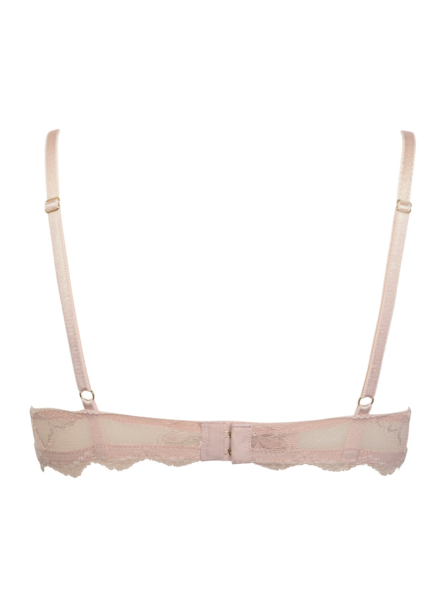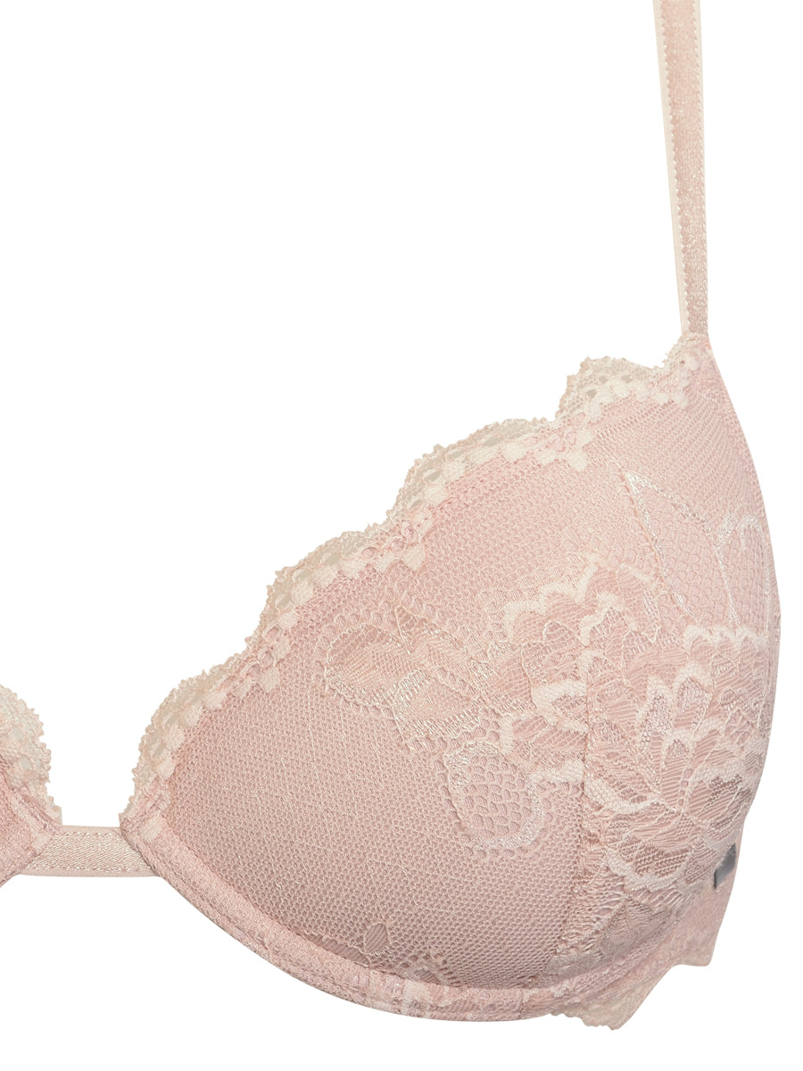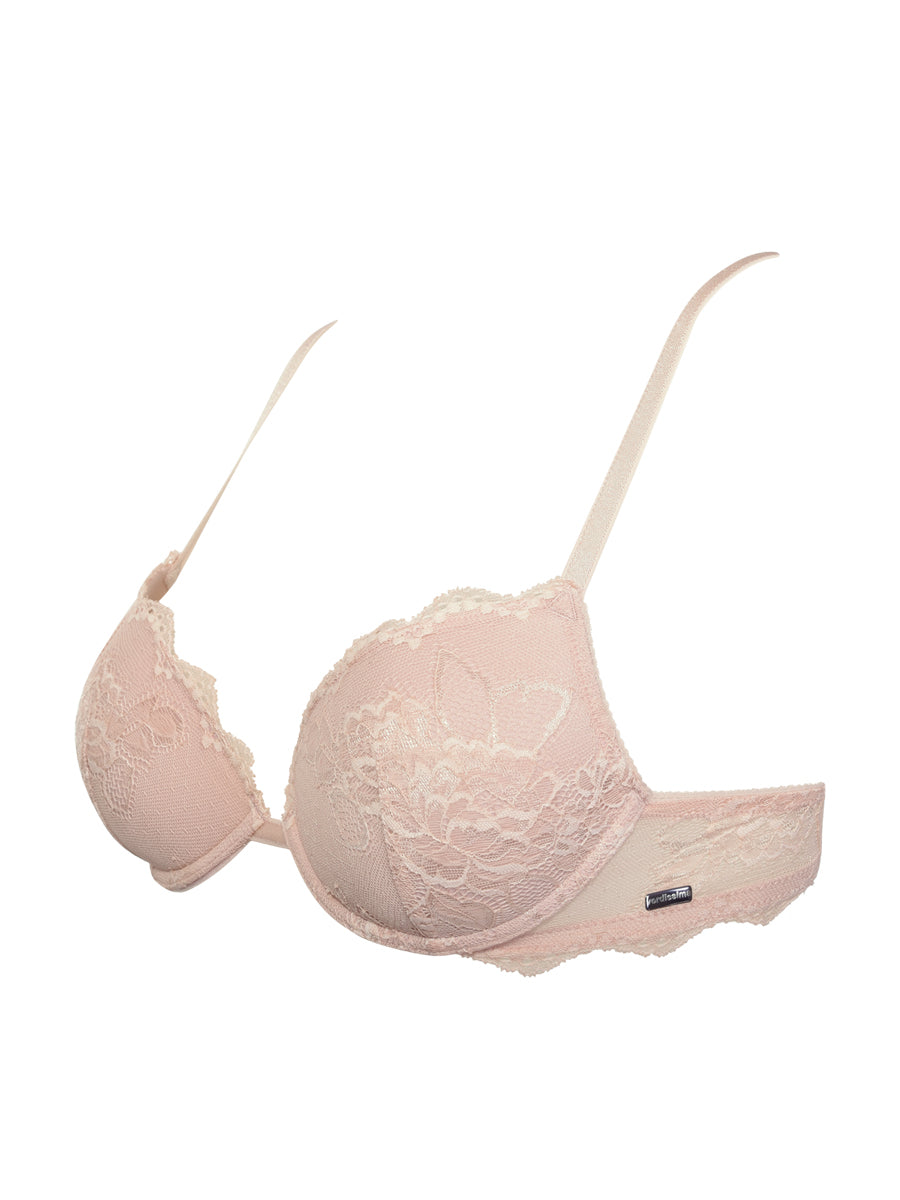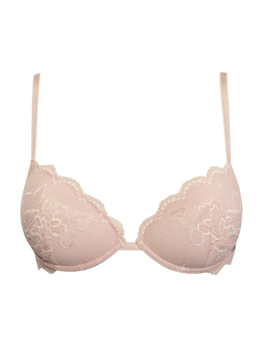 Push-up con coppe imbottite, ferretto e lunette estraibili. Reggiseno realizzato in morbido pizzo dal prezioso smerlo con romantica trama floreale. Ideale per valorizzare e sostenere il décolleté. Crea infinite combinazioni con gli slip in pizzo e microfibra in nuance.