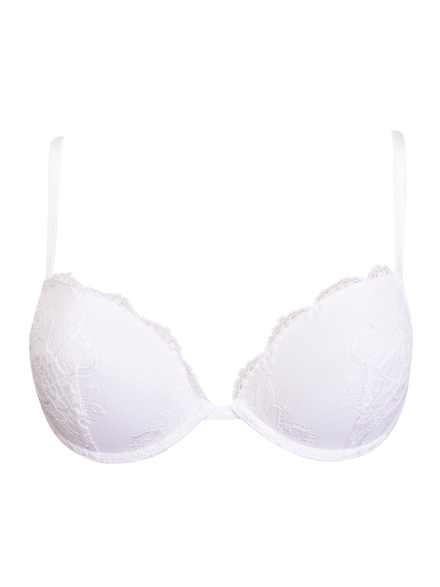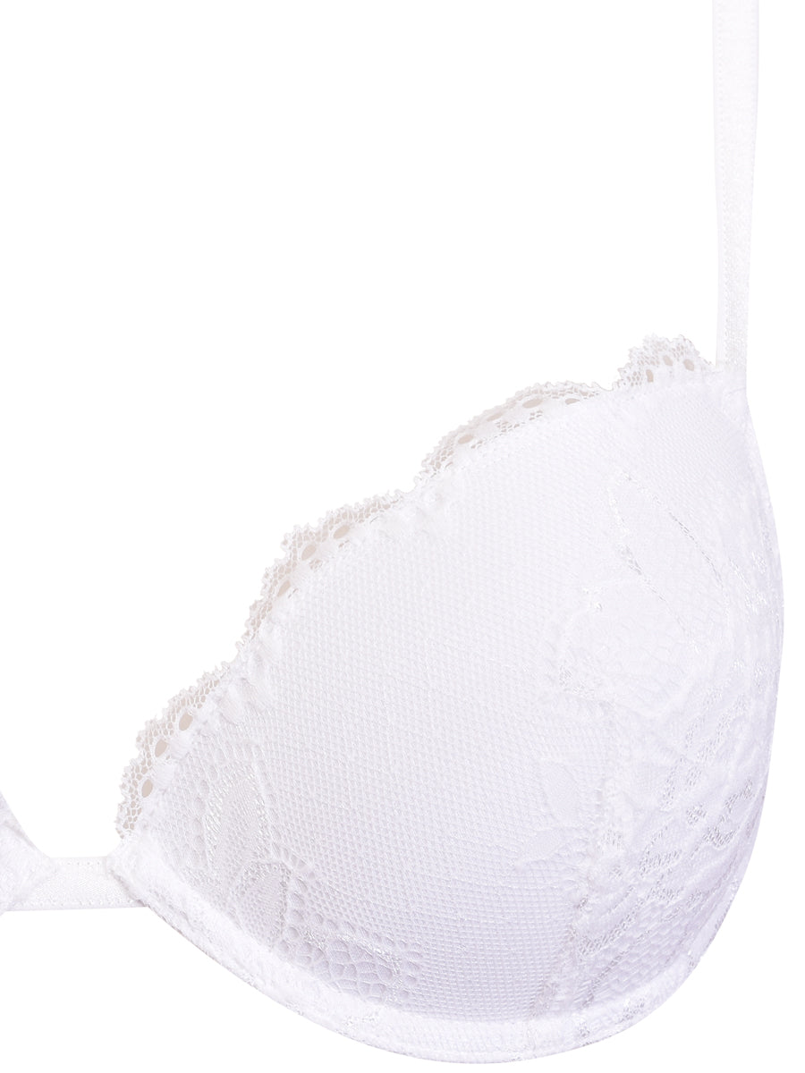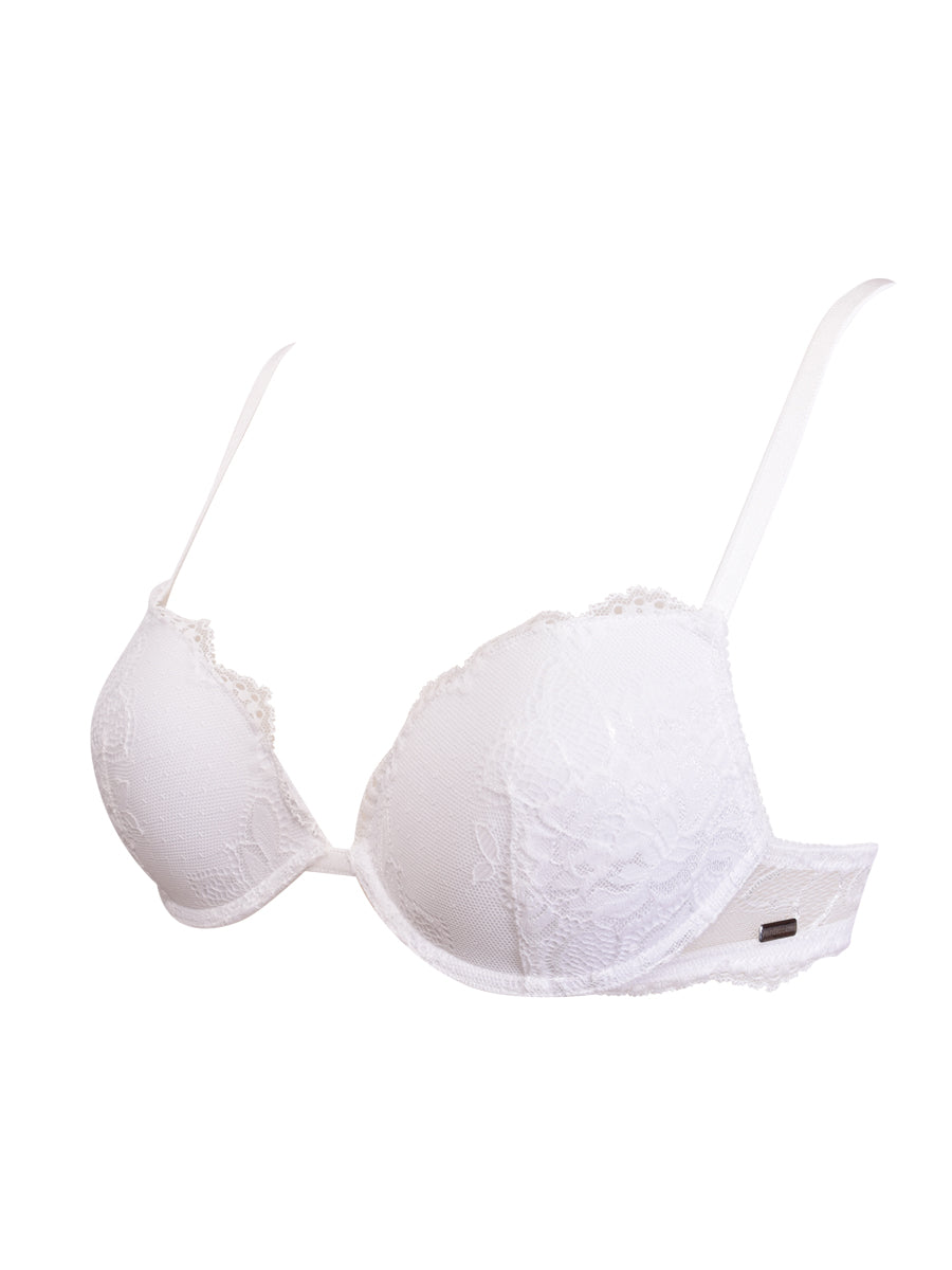 Push-up con coppe imbottite, ferretto e lunette estraibili. Reggiseno realizzato in morbido pizzo dal prezioso smerlo con romantica trama floreale. Ideale per valorizzare e sostenere il décolleté. Crea infinite combinazioni con gli slip in pizzo e microfibra in nuance.