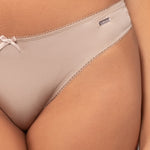La brasiliana della serie Macramè combina il comfort della microfibra con il fascino del pizzo lavorato macramè che arricchisce il retro del modello. Disponibile nelle tonalità tortora, salvia e nero che valorizzano la lavorazione del tessuto.