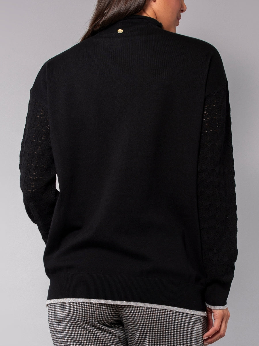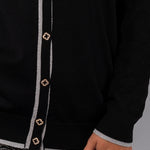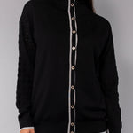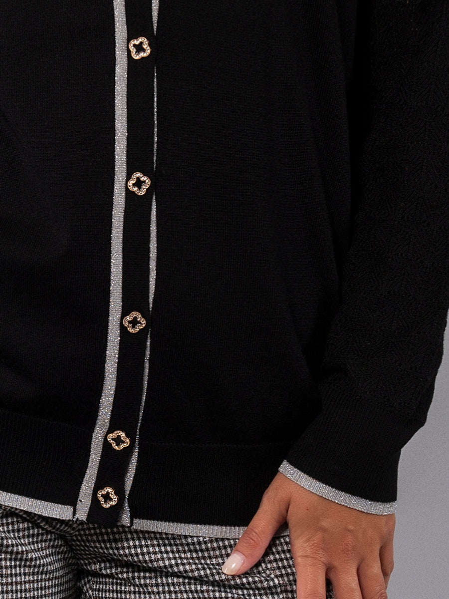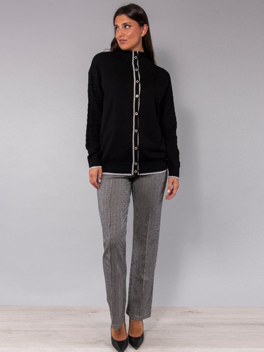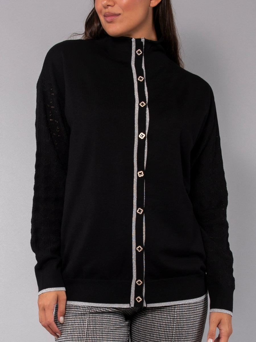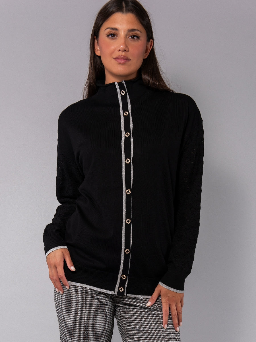 Il cardigan con collo alto e bottoni gioiello unisce stile raffinato e dettagli ricercati. realizzato in viscosa operata e impreziosito da bordature lurex a contrasto che aggiungono un tocco luminoso e prezioso a ogni look.