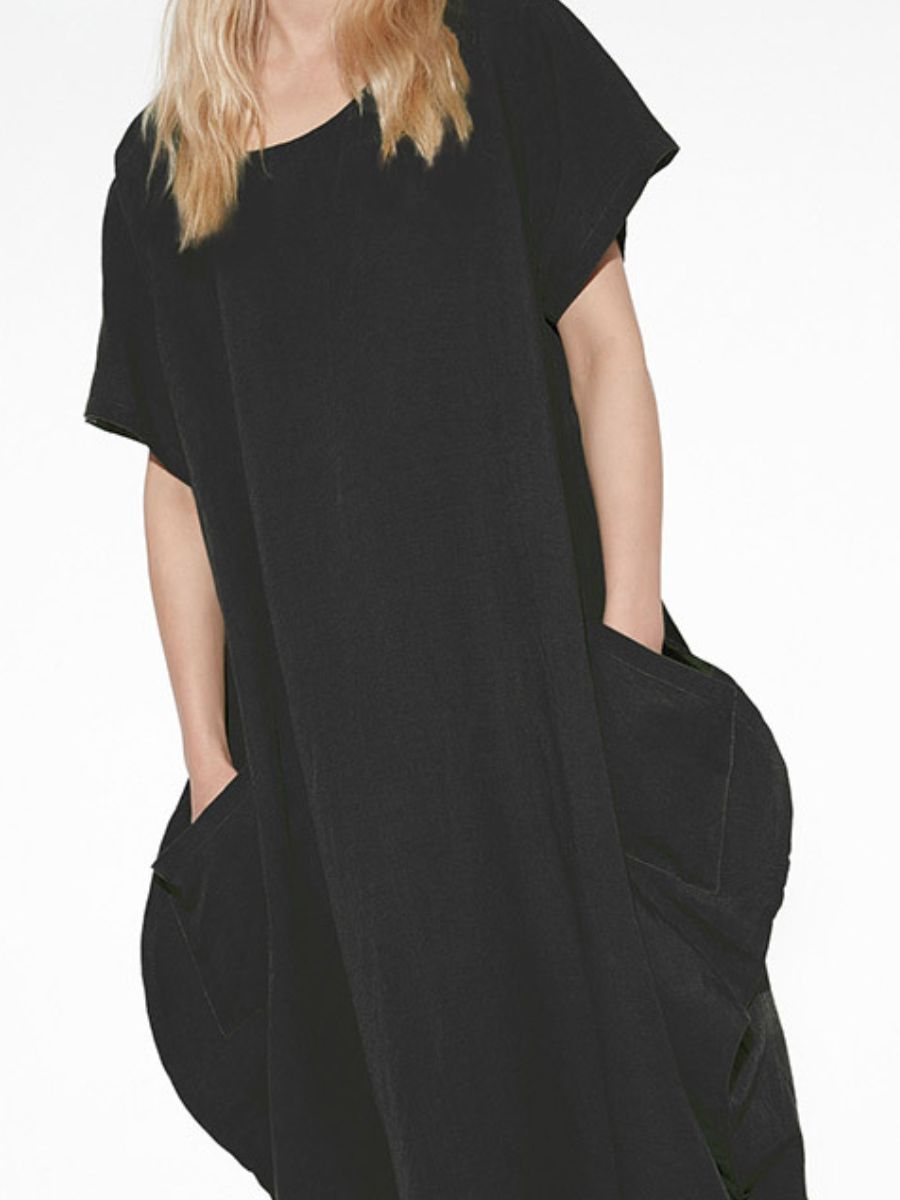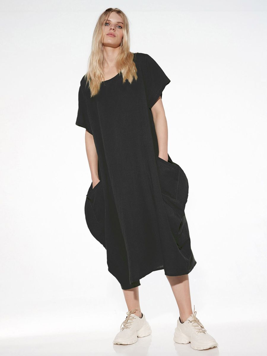 Questo abito midi realizzato in viscosa e lino combina praticità e stile in un design minimal e contemporaneo. Il taglio asimmetrico sul fondo dona movimento, mentre lo scollo tondo e le maniche corte esaltano la semplicità del modello. Le tasche frontali aggiungono un tocco funzionale e distintivo.