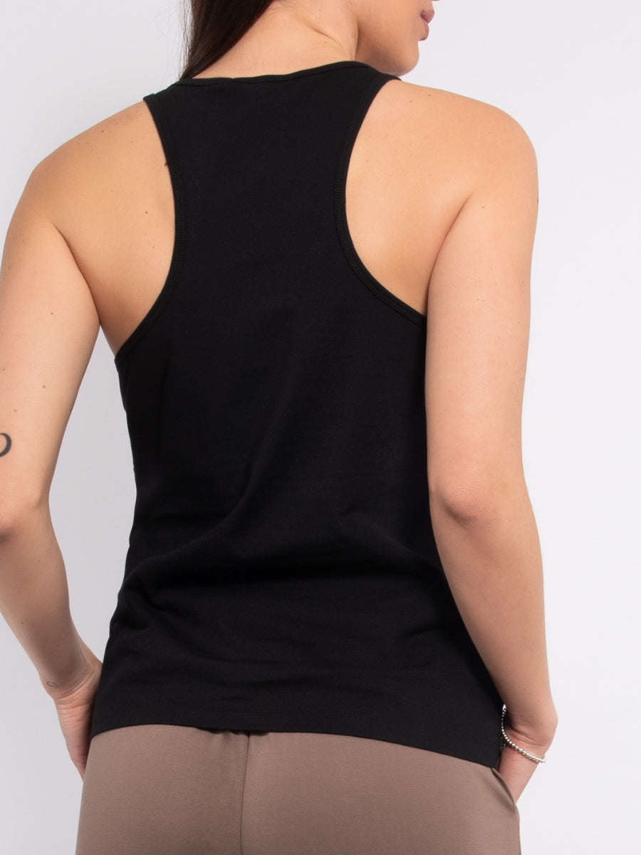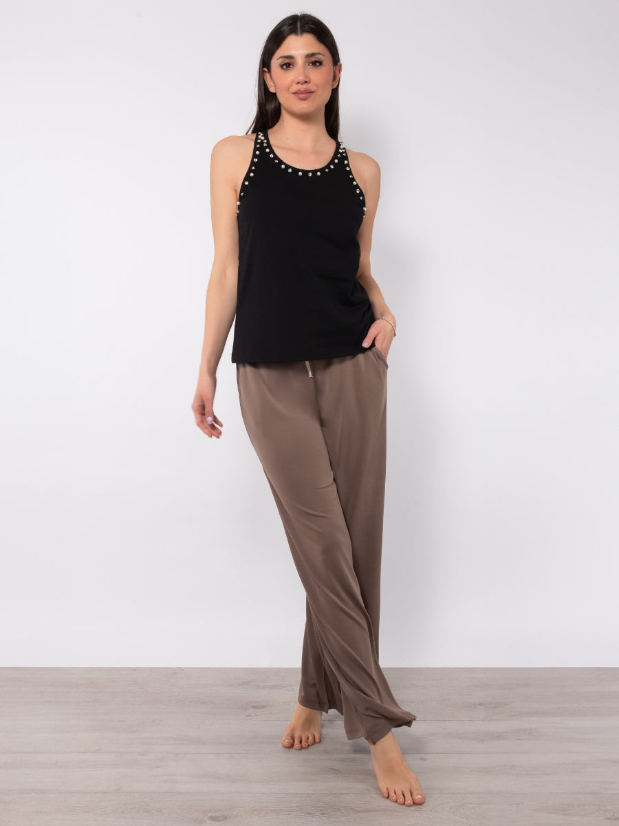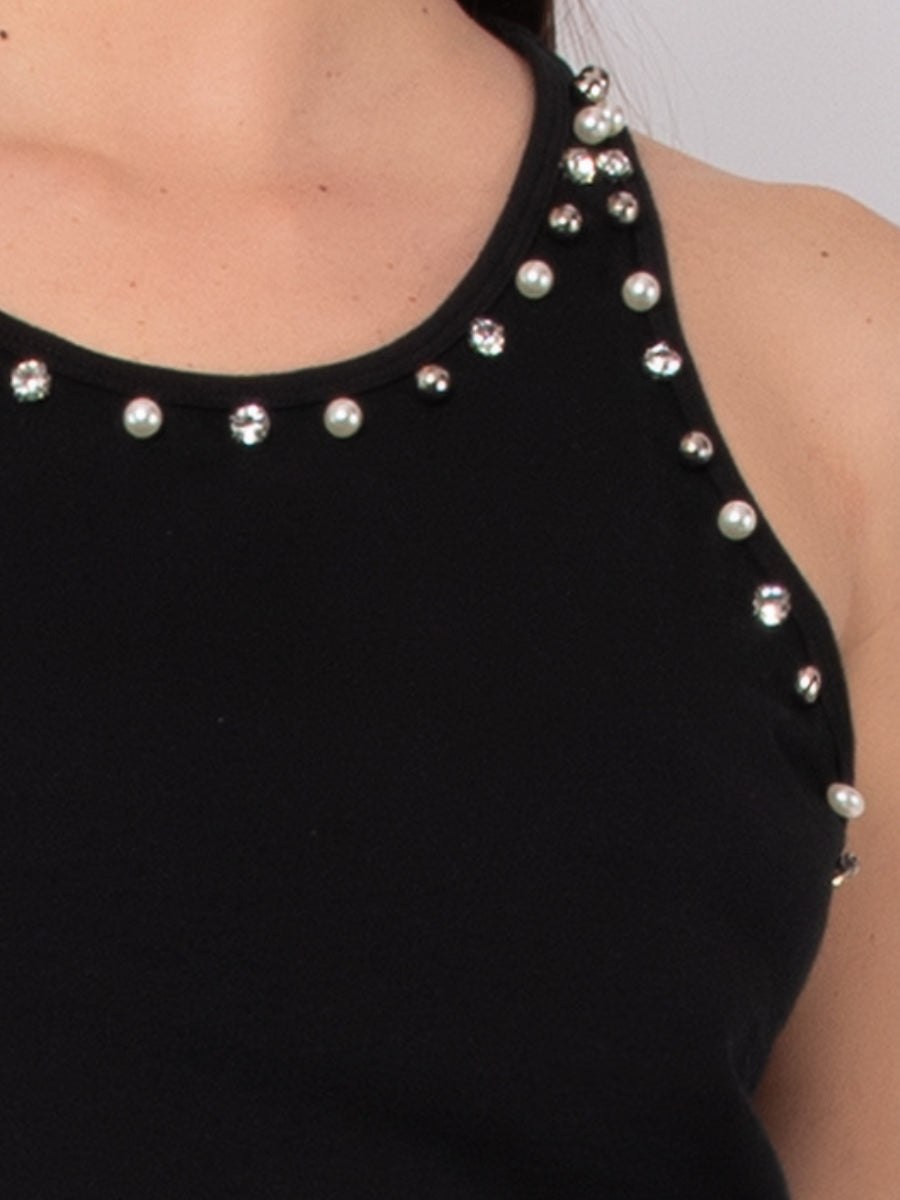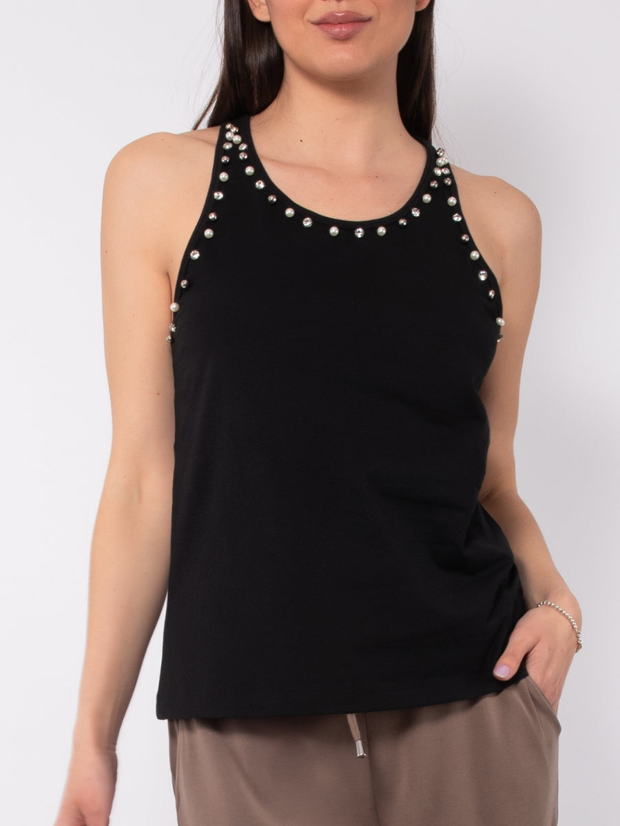 Canotta in cotone stretch con strass e perle - TS07