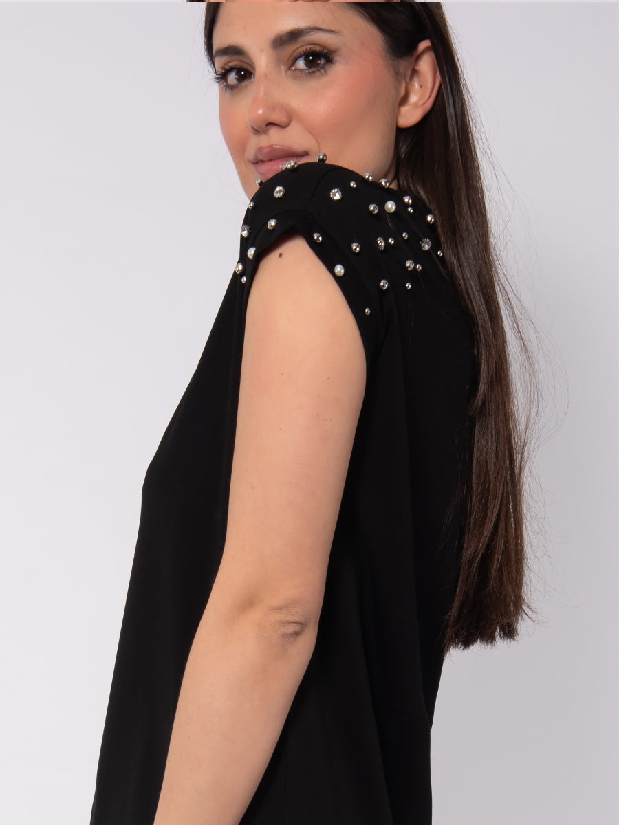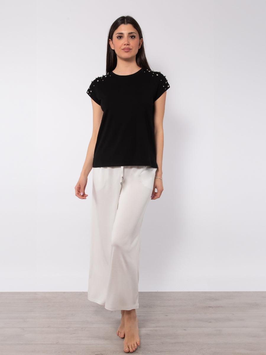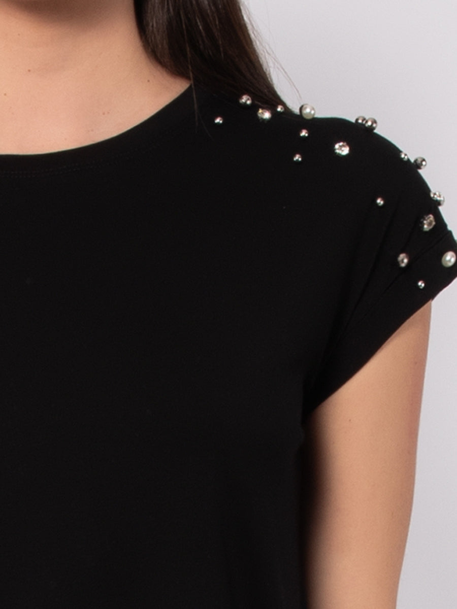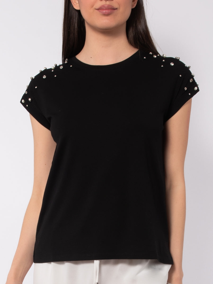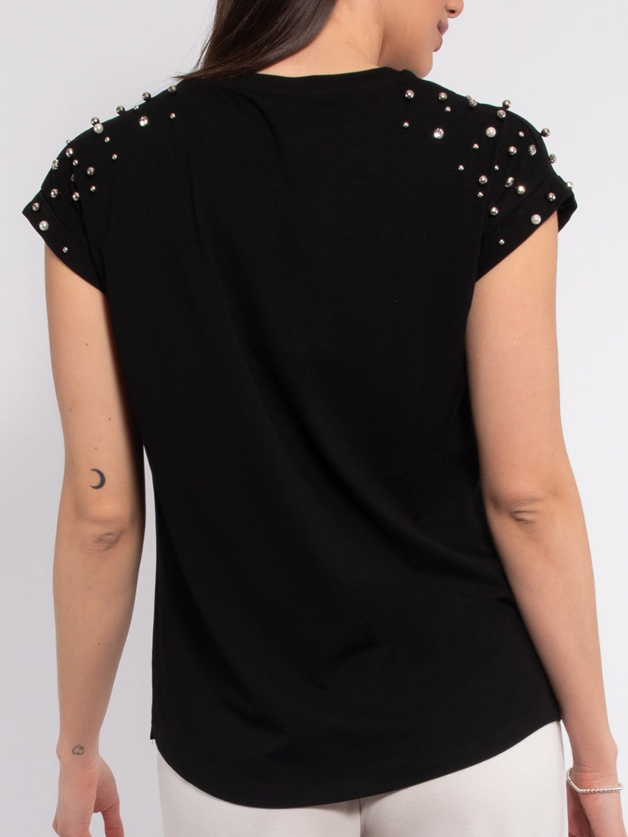 T-shirt in viscosa e cotone con strass e perle - NERO - TS15