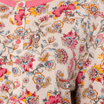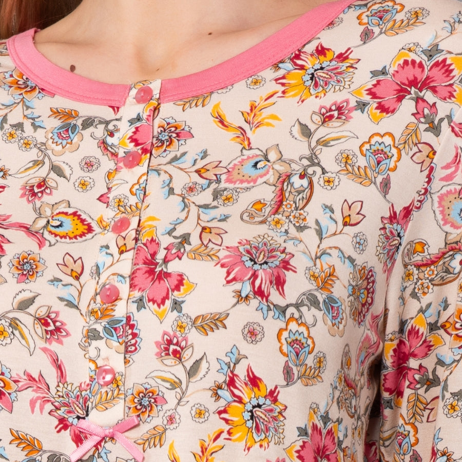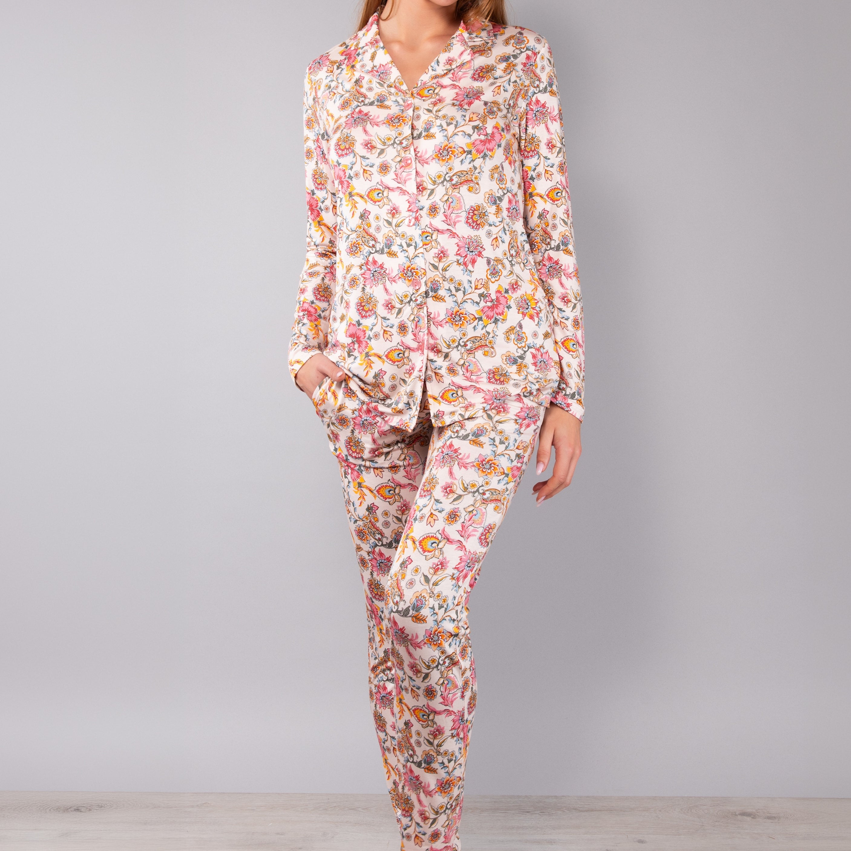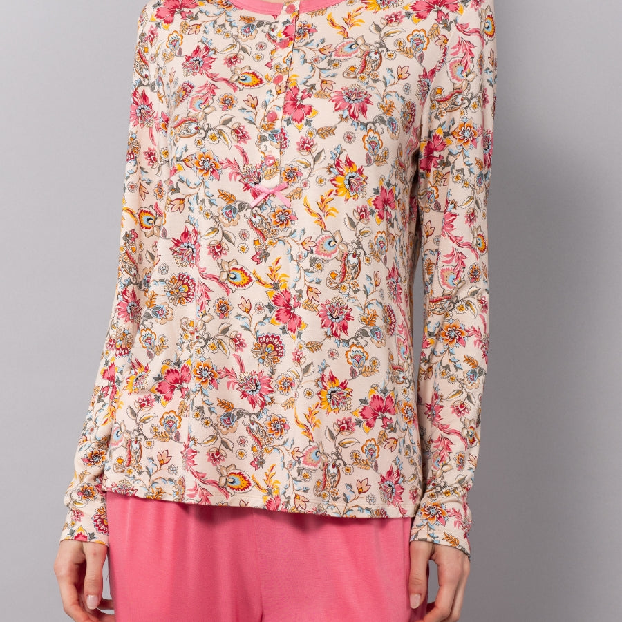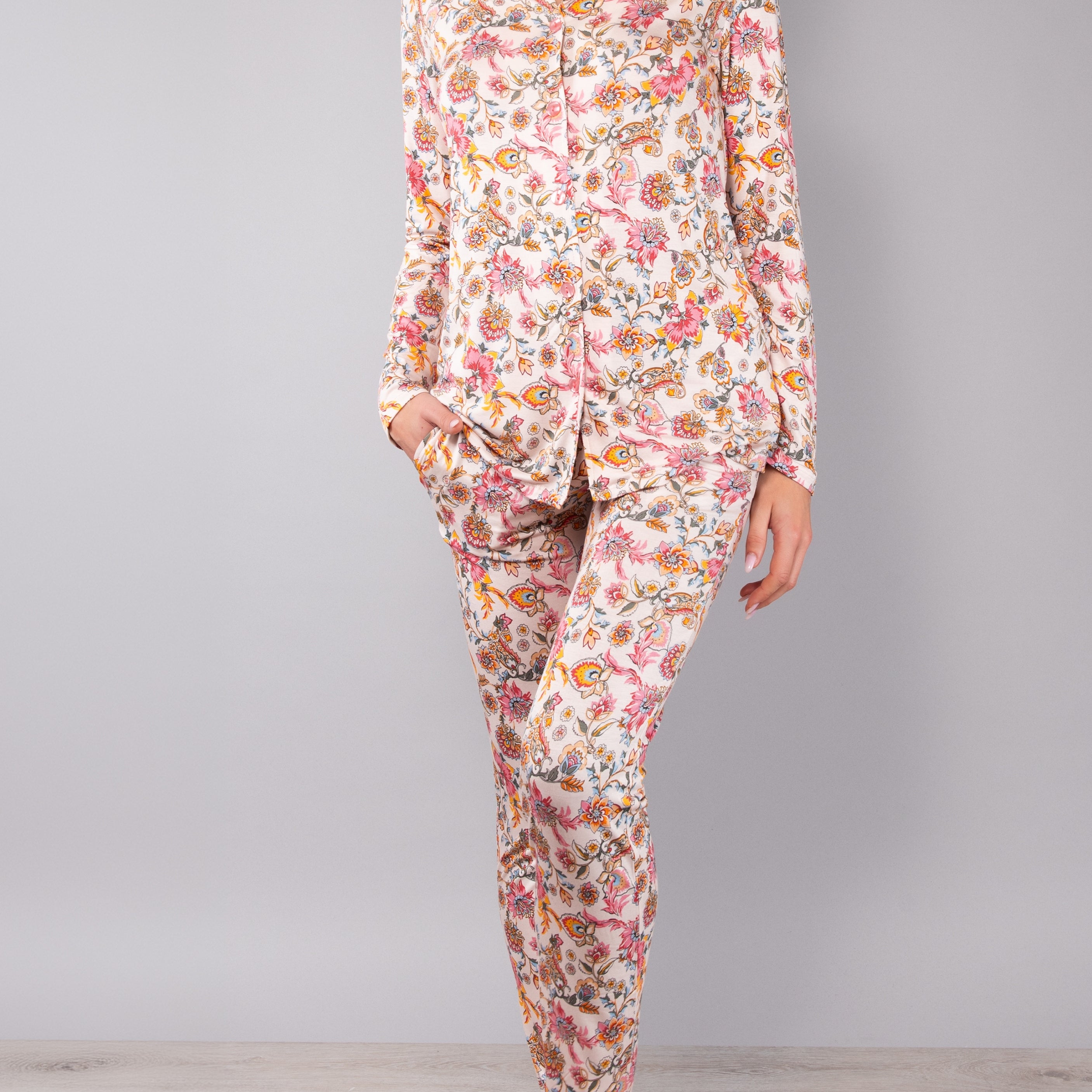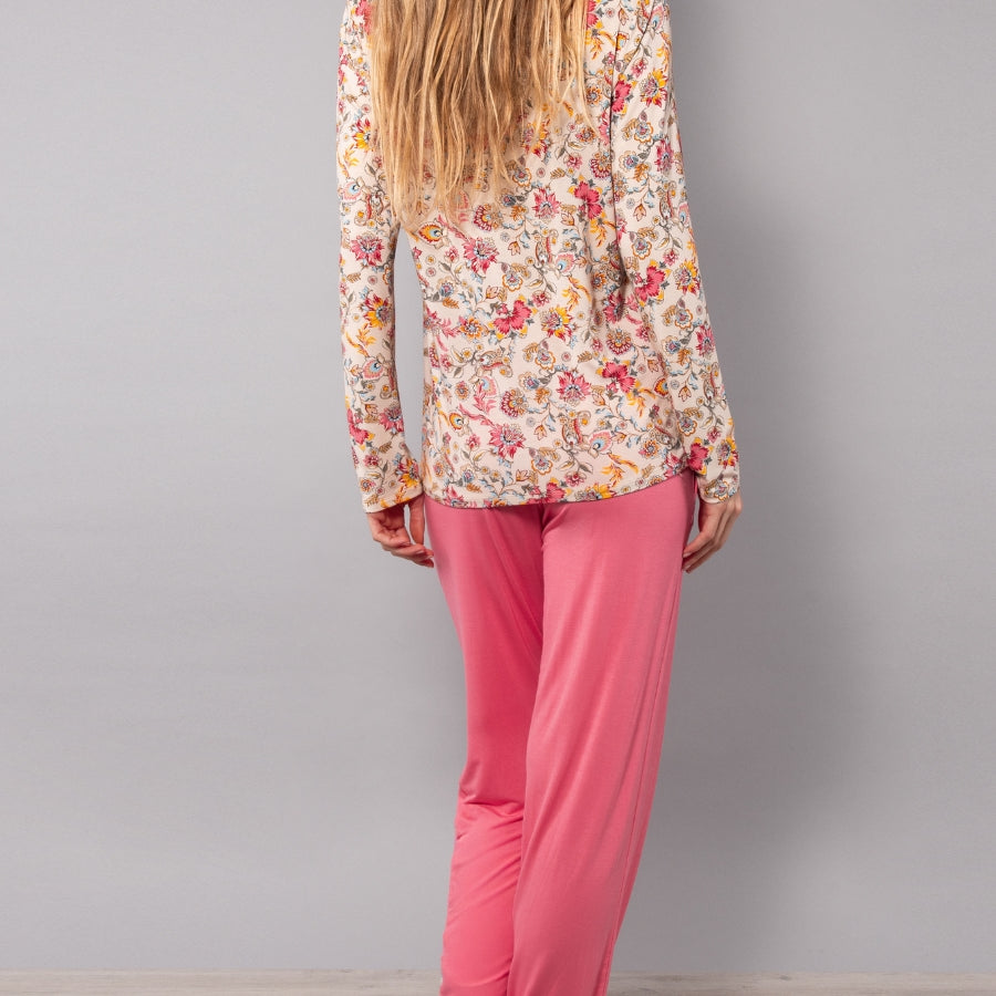 La stampa Lotus celebra un motivo floreale d'ispirazione vintage, declinato in una palette che unisce tocchi di fucsia e tonalità pastello. Un completo raffinato che unisce una femminilità senza tempo a un design funzionale, ideale per i momenti di relax.