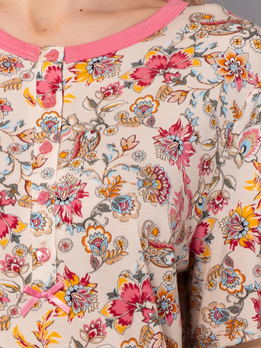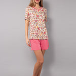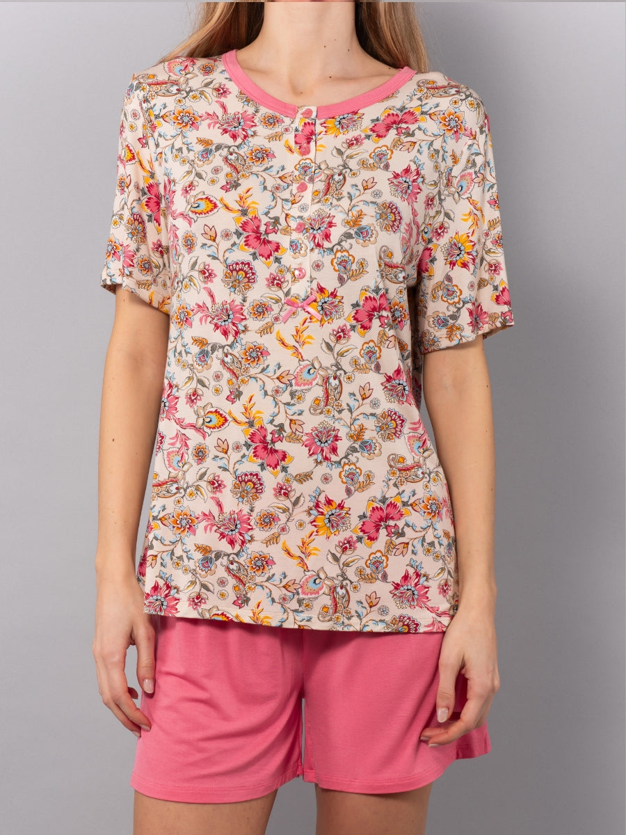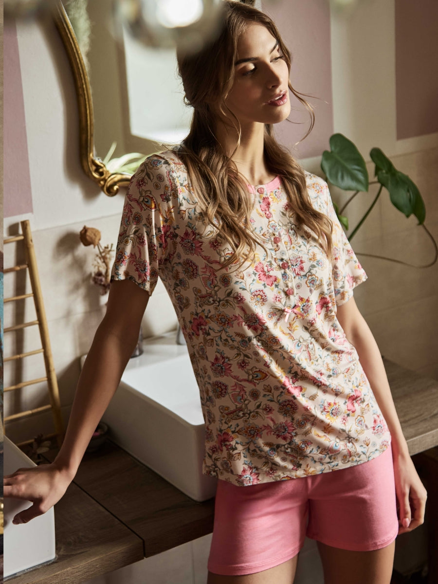 Pigiama corto realizzato in morbida e leggera viscosa con stampa floreale Lotus. Il set comprende la maglia serafino a manica corta con cinque bottoni e lo short coordinato a tinta unita con vita elasticizzata, pensato per offrire una vestibilità confortevole e fresca nelle stagioni più calde.