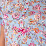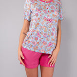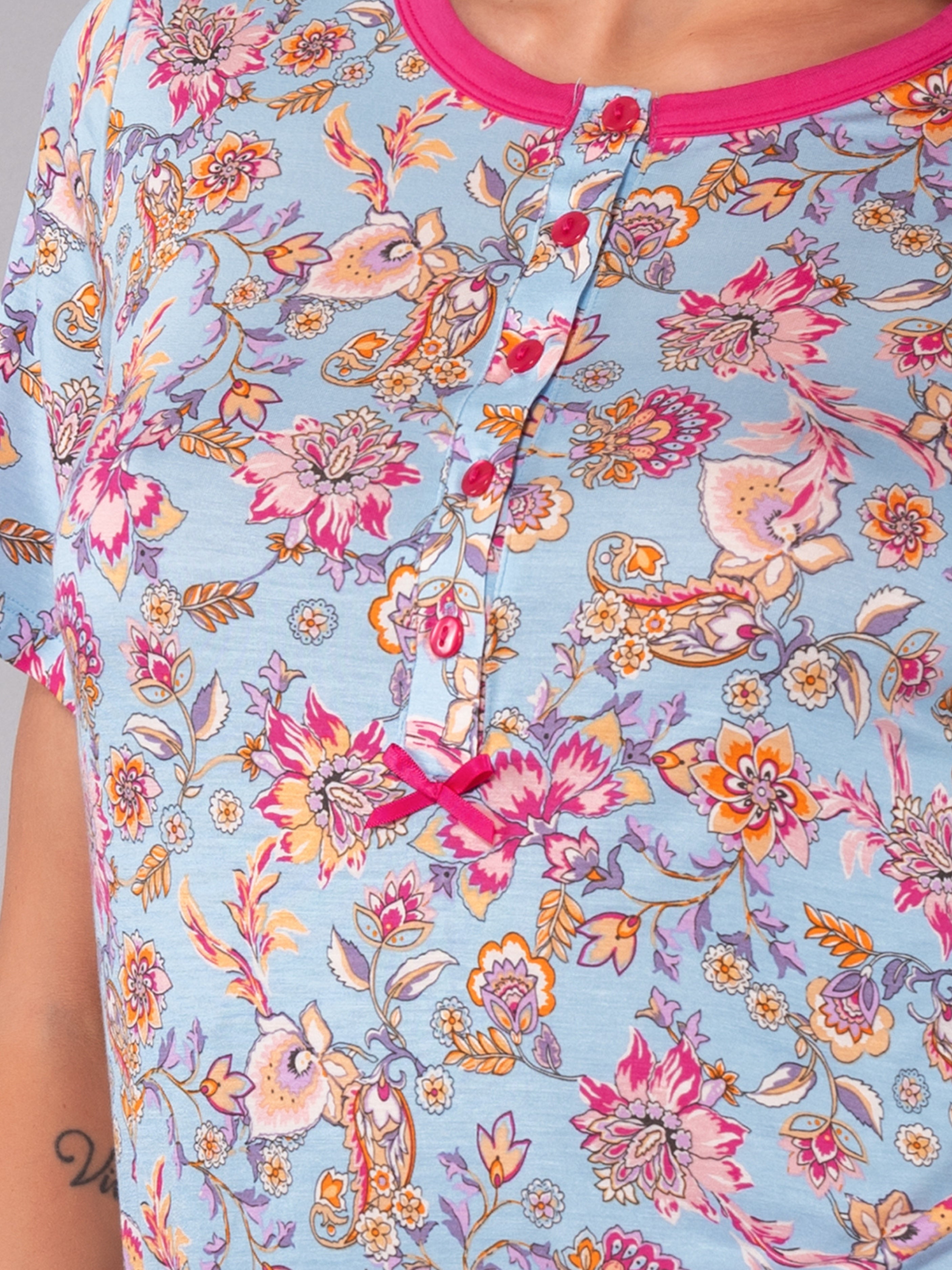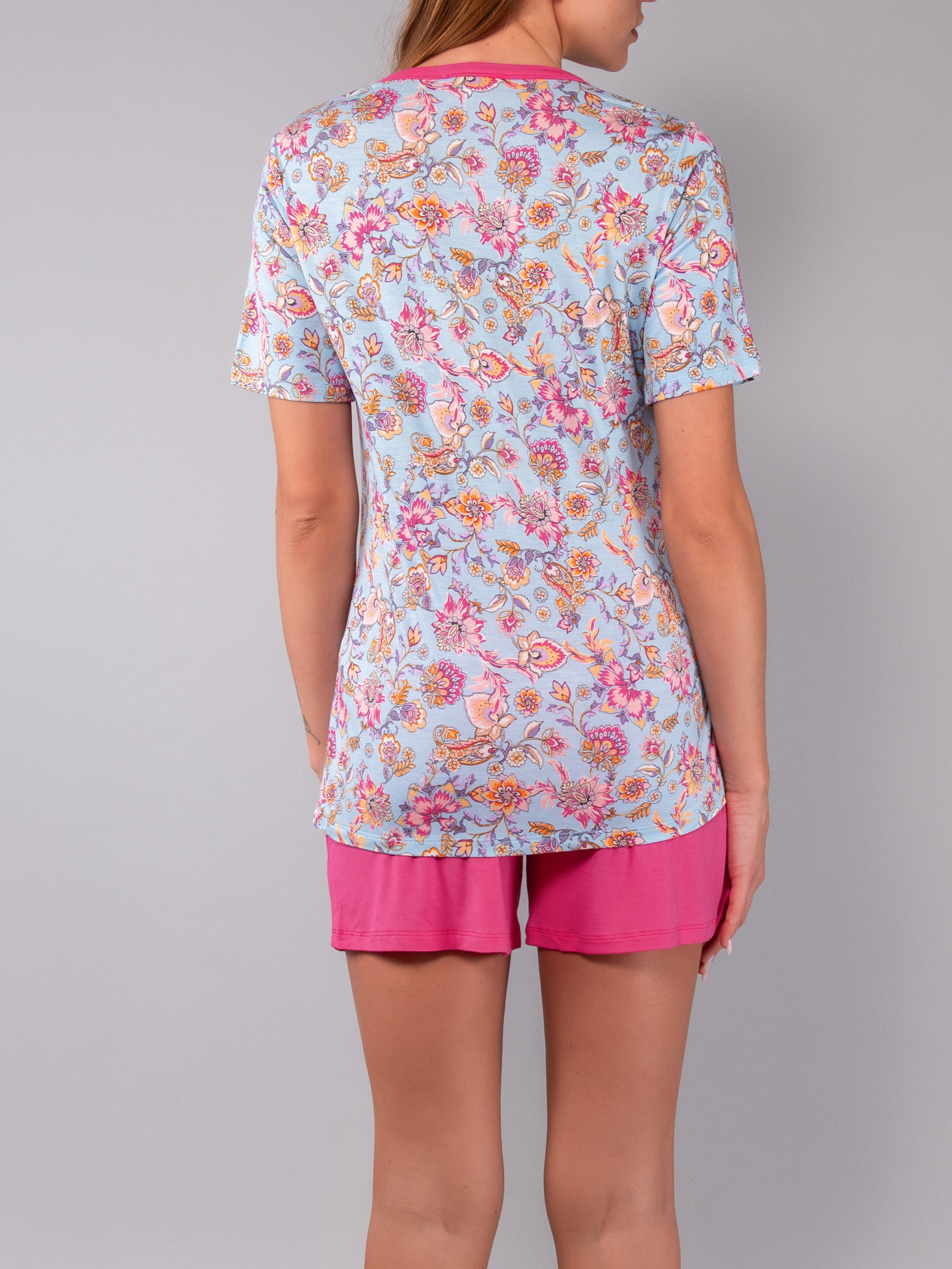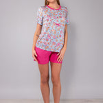 Pigiama corto realizzato in morbida e leggera viscosa con stampa floreale Lotus. Il set comprende la maglia serafino a manica corta con cinque bottoni e lo short coordinato a tinta unita con vita elasticizzata, pensato per offrire una vestibilità confortevole e fresca nelle stagioni più calde.