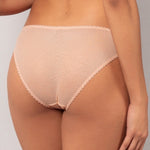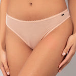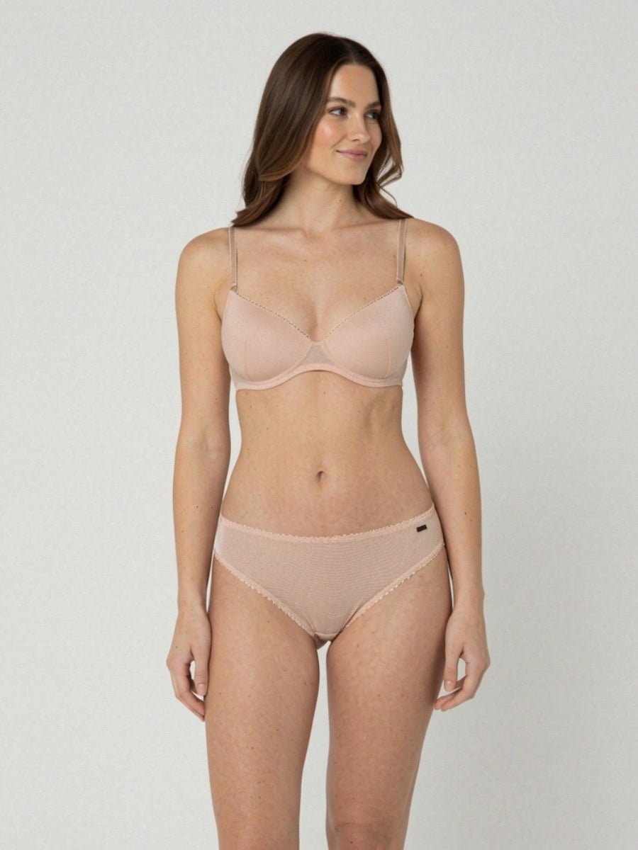 Realizzato in tulle leggero con un delicato effetto trasparente, questo slip assicura una vestibilità naturale e confortevole, perfetta per l'uso quotidiano. Lo stile minimale è impreziosito dalla sottile puntina in pizzo lungo i bordi, che dona un tocco raffinato ed elegante. Un modello essenziale e pratico, ideale da coordinare con i reggiseni della collezione per un look intimo moderno e sofisticato.
