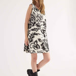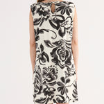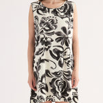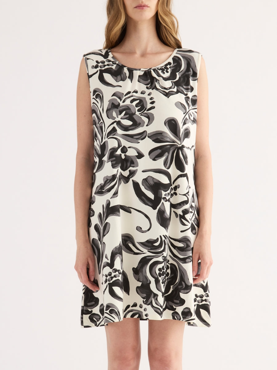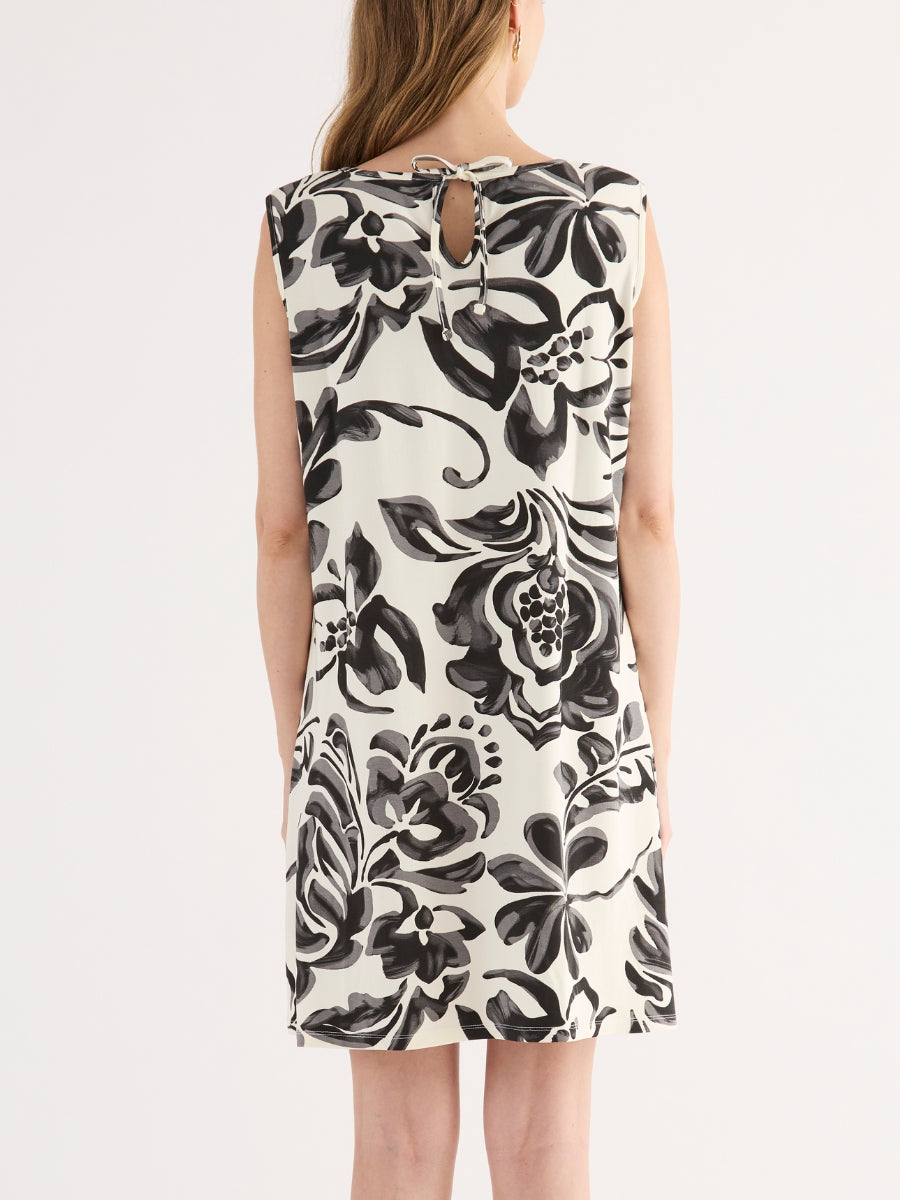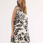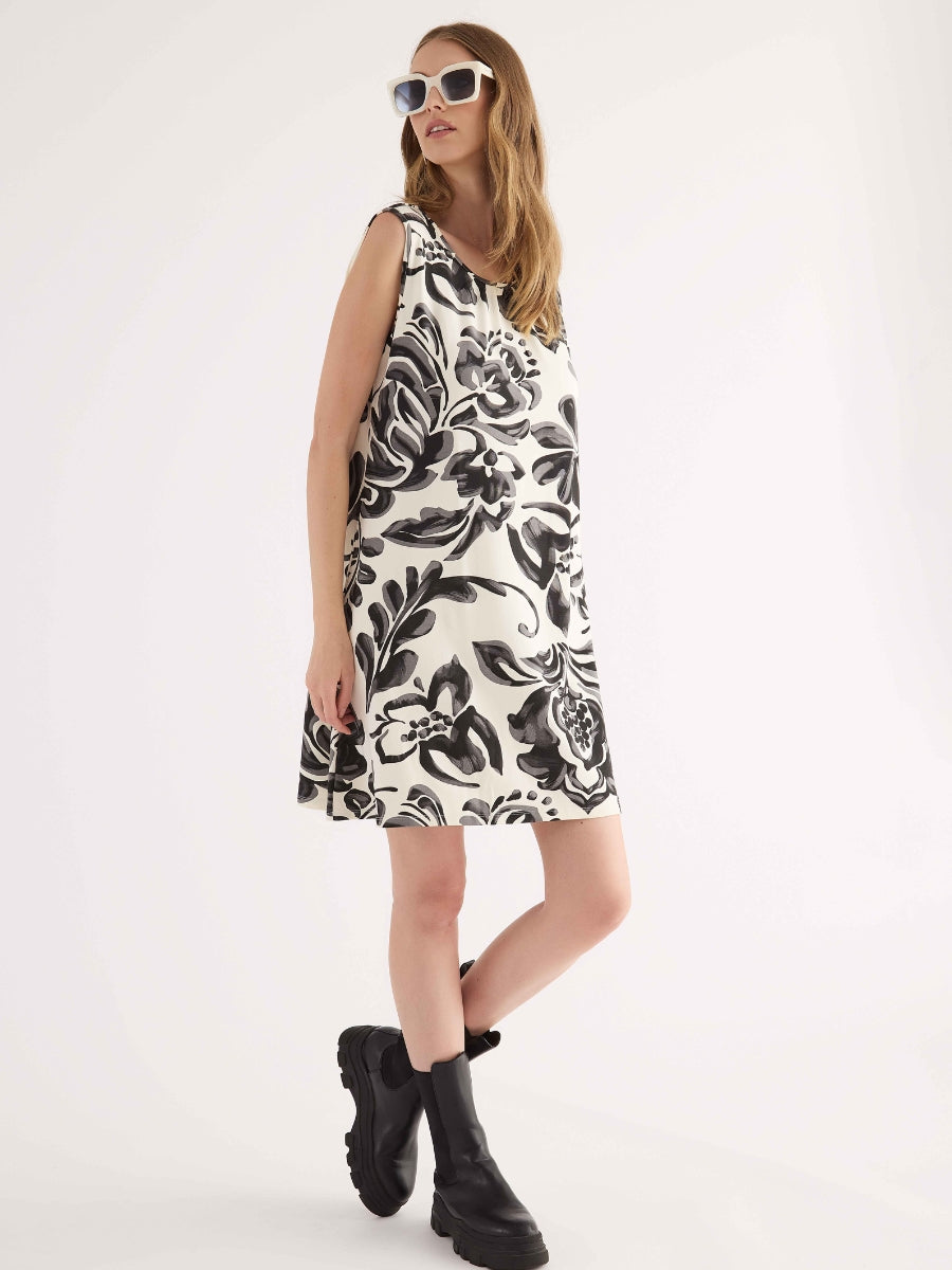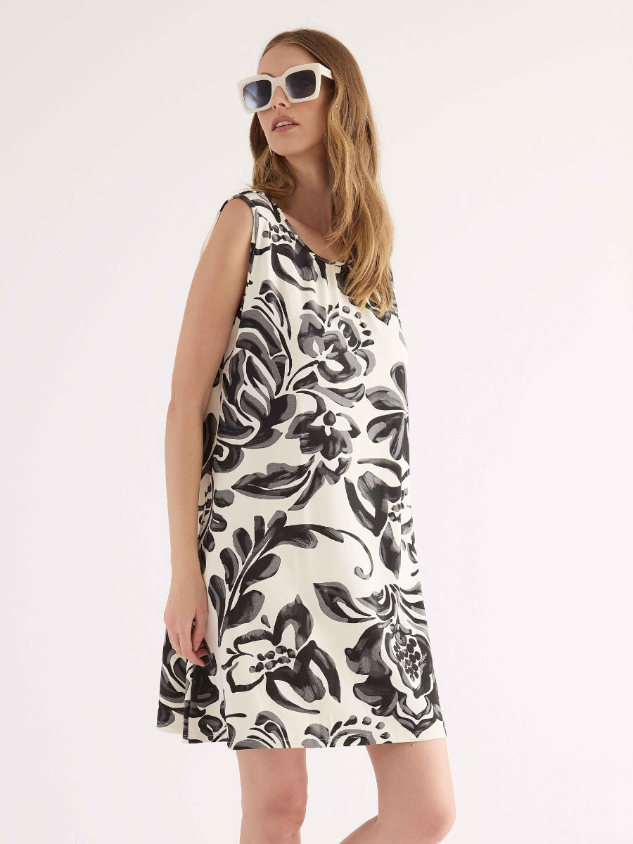Abito corto smanicato realizzato in viscosa leggera, caratterizzato da una macro stampa floreale con effetto pennellata. Il design, essenziale e raffinato, presenta scollo tondo, linea morbida ed è impreziosito sul retro da una raffinata chiusura con fiocco che crea un dettaglio oblò. Un capo sofisticato e versatile, ideale per chi desidera un look estivo distintivo e ricco di carattere.