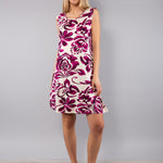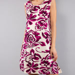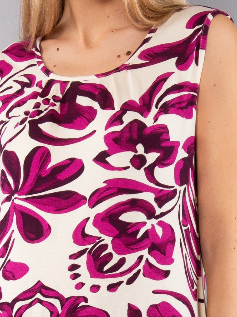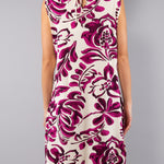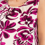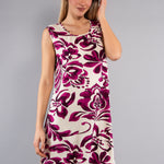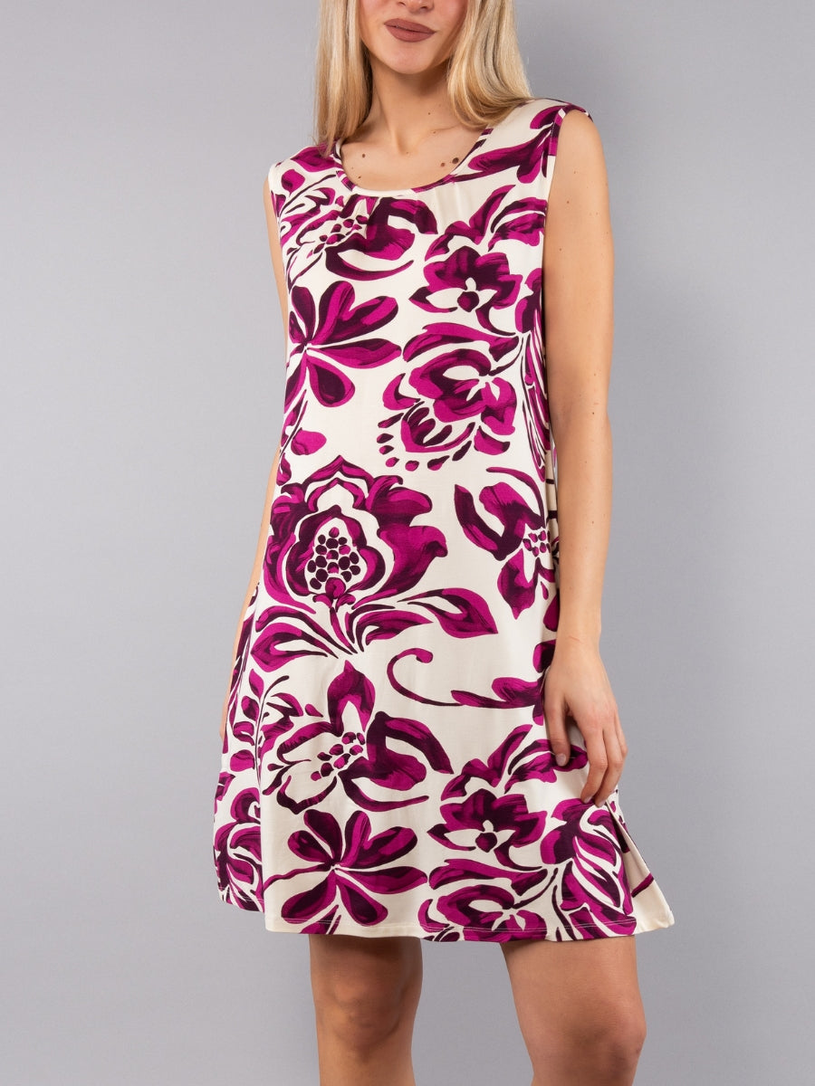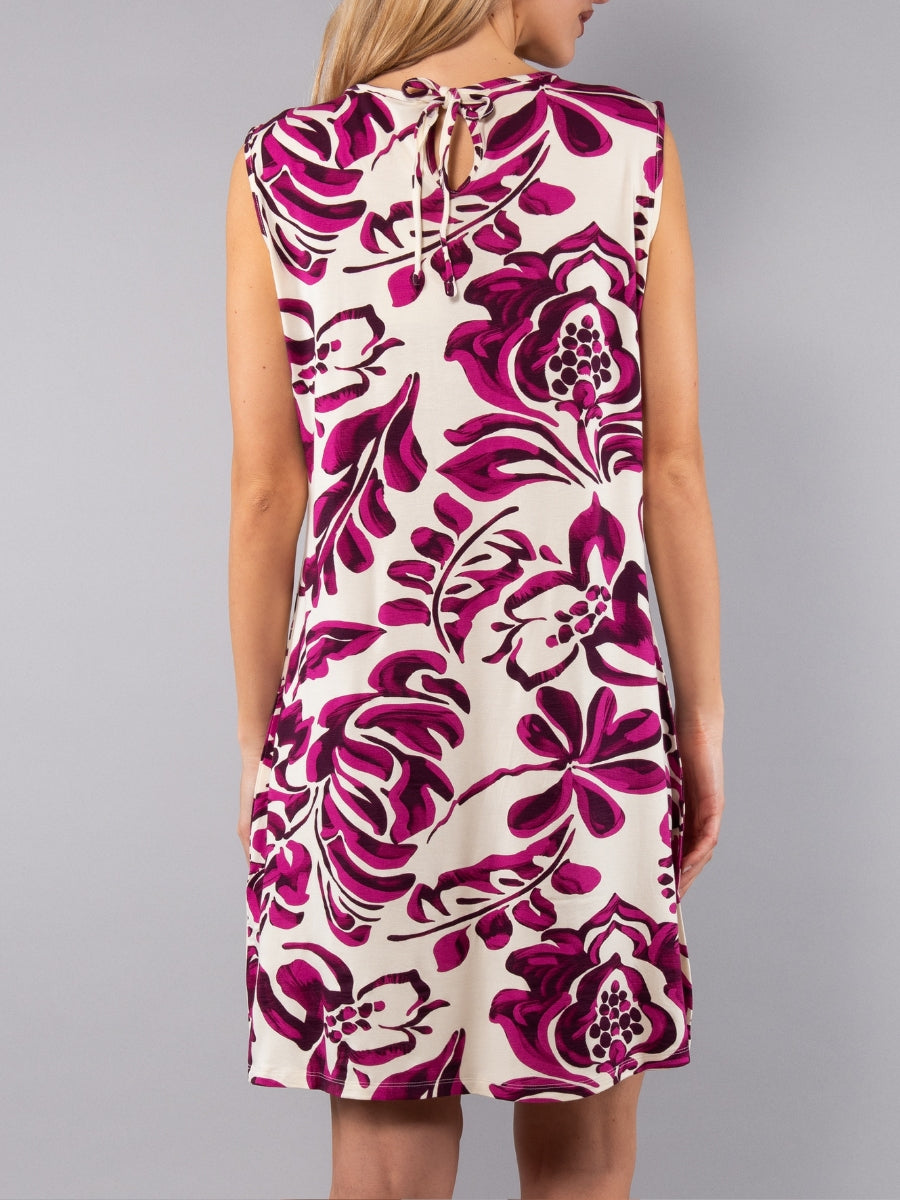 Abito corto smanicato realizzato in viscosa leggera, caratterizzato da una macro stampa floreale con effetto pennellata. Il design, essenziale e raffinato, presenta scollo tondo, linea morbida ed è impreziosito sul retro da una raffinata chiusura con fiocco che crea un dettaglio oblò. Un capo sofisticato e versatile, ideale per chi desidera un look estivo distintivo e ricco di carattere.